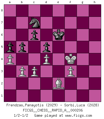 Last move : 1/2-1/2 2018 July 9 21:39:17 [Event "FICGS__CHESS__RAPID_A__000206"] [Site "FICGS"] [Date "2017.12.03"] [Round "1"] [White "Frendzas,Panayotis"] [Black "Sorbi,Luca"] [Result "1/2-1/2"] [WhiteElo "2029"] [BlackElo "2028"] 1.e4 e5 2.Nf3 Nf6 3.Nxe5 d6 4.Nf3 Nxe4 5.Nc3 Nxc3 6.dxc3 Be7 7.Be3 Nc6 8.Qd2 Be6 9.O-O-O Qd7 10.Kb1 Bf6 11.Bg5 Bxg5 12.Nxg5 O-O-O 13.Nxe6 Qxe6 14.g3 Kb8 15.Bg2 Rhe8 16.Rhe1 Qd7 17.b3 Rxe1 18.Rxe1 Re8 19.Rxe8+ Qxe8 20.Kb2 Qe7 21.a4 Nd8 22.Qd4 f6 23.Qd3 g6 24.h4 f5 25.h5 Qg5 26.Bd5 Qxh5 27.Qe3 f4 28.Qe8 Qg5 29.gxf4 Qf6 30.Be4 c6 31.f5 Kc7 32.fxg6 hxg6 33.Bxg6 Ne6 34.Bd3 Nf4 35.Bf1 Nd5 36.Qe1 a5 37.Qd2 Qe5 38.Qd3 Qf6 39.Qd4 Qg5 40.Bd3 Nf4 41.Qe3 Qf6 42.Bc4 Qe5 43.Qd4 Qxd4 44.cxd4 Nh3 45.f3 d5 46.Bf1 Ng5 47.Be2 Ne6 48.Kc3 Kd6 49.Kd3 b5 50.Ke3 Nc7 51.c3 Ke6 52.Kf4 1/2-1/2 Petrov : Nimzovich attack Queenside Castling by player White (move 9) Queenside Castling by player Black (move 12) This chess game ended in a draw. Follow this game move after move (download)The blunders are all there on the board, waiting to be made. (Savielly Tartakover) Der zweitbeste Zug ist oft der einzig richtige. (Savielly Grigorievitsch Tartakower) Yo no creo en la psicología. Yo creo en las buenas movidas. (Bobby Fischer) Seul un grand joueur sait à quel point il joue faiblement. (Xavier Tartacover) Never risk one's whole fortune unless supported by one's entire army. (Niccolo Machiavelli)
