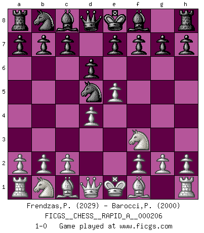 Last move : 1-0 2018 January 8 10:41:47 [Event "FICGS__CHESS__RAPID_A__000206"] [Site "FICGS"] [Date "2017.12.03"] [Round "1"] [White "Frendzas,Panayotis"] [Black "Barocci,Paolo"] [Result "1-0"] [WhiteElo "2029"] [BlackElo "2000"] 1.e4 Nf6 2.e5 Nd5 3.d4 d6 4.Nf3 1-0 This chess game has been lost on time (started : 2017.12.03 10:35:47) Alekhine's defense : Modern variation Player White won this chess game. Follow this game move after move (download)Whoever sees no other aim in the game than that of giving checkmate to one's opponent will never become a good Chess player. (Euwe) Ich spiele ehrlich und spiele, um zu gewinnen. Wenn ich verliere nehme ich meine Medizin. (Robert James Fischer) No es tiempo de jugar al Ajedrez cuando la casa esta en llamas. (Proverbio Italiano) Des idées, des idées, j'en ai cent, j'en ai mille. Des bonnes, des mauvaises, applicables, irréalisables... Il suffit de faire le tri ! (Roos) The general who wins the battle makes many calculations in his temple before the battle is fought. The general who loses makes but few calculations beforehand. (Sun Tzu)