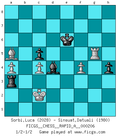 Last move : 1/2-1/2 2018 July 19 20:7:47 [Event "FICGS__CHESS__RAPID_A__000206"] [Site "FICGS"] [Date "2017.12.03"] [Round "1"] [White "Sorbi,Luca"] [Black "Sinsuat,Datuali"] [Result "1/2-1/2"] [WhiteElo "2028"] [BlackElo "1980"] 1.e4 c6 2.d4 d6 3.Nc3 Nd7 4.Nf3 Qc7 5.Bd3 Ngf6 6.O-O e5 7.Qe2 Be7 8.Rd1 O-O 9.h3 b5 10.dxe5 dxe5 11.a4 b4 12.Nb1 Nc5 13.b3 Rd8 14.Bb2 Nfxe4 15.Bxe4 Rxd1+ 16.Qxd1 Nxe4 17.Bxe5 Qd7 18.Nbd2 Nxd2 19.Qxd2 Qxd2 20.Nxd2 f6 21.Bf4 Be6 22.Be3 Rd8 23.Kf1 Kf7 24.Ne4 a5 25.Re1 Rd5 26.f3 Bc8 27.Kf2 g5 28.Rc1 h6 29.Nd2 f5 30.g3 Bf6 31.f4 Ba6 32.Rh1 gxf4 33.gxf4 Bh4+ 34.Kf3 Rd8 35.Rc1 Rg8 36.Rg1 Re8 37.Rd1 Rg8 38.Rg1 Rd8 39.Rc1 c5 40.Nc4 Bxc4 41.bxc4 Bf6 42.Rb1 Rd6 43.Rc1 h5 44.Re1 Bd4 45.Rd1 Ke7 46.Bf2 Kd7 47.Rd2 Kc7 48.Be1 Rb6 49.Rg2 b3 50.cxb3 Rxb3+ 51.Ke2 Re3+ 52.Kf1 Rf3+ 53.Ke2 Re3+ 54.Kd1 Rd3+ 55.Kc2 Rxh3 56.Rg5 Kd6 57.Rxf5 Ke6 58.Rg5 Ra3 59.Bxa5 h4 1/2-1/2 Caro-Kann defense Kingside Castling by player White (move 6) Kingside Castling by player Black (move 8) This chess game ended in a draw. Follow this game move after move (download)After black's reply to 1.e4 with 1..e5, leaves him always trying to get into the game. (Howard Staunton) Habe Mut, dich deines eigenen Verstandes zu bedienen. (Immanuel Kant) Coloca el contenido de las piezas del Ajedrez en un sombrero, agitalo vigorosamente, arrojalas en un tablero desde una altura de 30 centimetros y así obtendras el estilo de Steinitz. (H. E. Bird) Les échecs, c'est l'art d'analyser. (Mikhail Botvinnik) If computers get too powerful, we can organize them into committees. That'll do them in. (Anonymous)