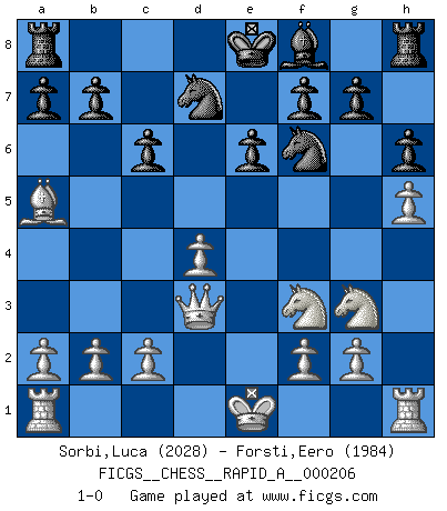 Last move : 1-0 2018 February 6 16:25:21 [Event "FICGS__CHESS__RAPID_A__000206"] [Site "FICGS"] [Date "2017.12.03"] [Round "1"] [White "Sorbi,Luca"] [Black "Forsti,Eero"] [Result "1-0"] [WhiteElo "2028"] [BlackElo "1984"] 1.e4 c6 2.d4 d5 3.Nc3 dxe4 4.Nxe4 Bf5 5.Ng3 Bg6 6.h4 h6 7.Nf3 Nd7 8.h5 Bh7 9.Bd3 Bxd3 10.Qxd3 e6 11.Bf4 Qa5+ 12.Bd2 Ngf6 13.Bxa5 1-0 Caro-Kann : Classical, 7...Nd7 Player White won this chess game. Follow this game move after move (download)You sit at the board and suddenly your heart leaps. Your hand trembles to pick up the piece and move it. But what Chess teaches you is that you must sit there calmly and think about whether it's really a good idea and whether there are other better ideas. (Stanley Kubrick) Jede Eröffnung ist gut genug um gespielt zu werden, wenn nur ihr Ruf schlecht genug ist. (Savielly Grigorievitsch Tartakower) Del Ajedrez se ha dicho que la vida no es lo suficientemente larga para él, pero eso es culpa de la vida, no del Ajedrez. (William Ewart Napier) Les Echecs ne sont pas pour les âmes timides. Ils requièrent un homme entier, qui ne s'arrête pas aveuglément à ce qui a été déjà établi, mais qui tente individuellement de sonder les profondeurs du jeu. (W. Steinitz) At work, the authority of a person is inversely proportional to the number of pens that person is carrying. (Dan Rotaru)