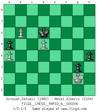 Last move : 1/2-1/2 2018 May 3 0:31:47 [Event "FICGS__CHESS__RAPID_A__000206"] [Site "FICGS"] [Date "2017.12.03"] [Round "1"] [White "Sinsuat,Datuali"] [Black "Mevel,Alberic"] [Result "1/2-1/2"] [WhiteElo "1980"] [BlackElo "2104"] 1.e4 c5 2.Nf3 d6 3.d4 cxd4 4.Nxd4 Nf6 5.Nc3 a6 6.Be3 e6 7.f3 b5 8.Qd2 b4 9.Na4 Nbd7 10.O-O-O Qa5 11.b3 Bb7 12.Kb1 Nc5 13.a3 Nxa4 14.axb4 Qc7 15.bxa4 Be7 16.Rc1 O-O 17.c3 Rfb8 18.Bd3 Nd7 19.Bc2 Ne5 20.Bb3 d5 21.Bf4 Bd6 22.Qc2 dxe4 23.fxe4 Rd8 24.Rhd1 Nc4 25.Bxd6 Nxd6 26.Re1 Rac8 27.Kb2 a5 28.b5 Ba8 29.Re3 Qb6 30.Qe2 Nb7 31.Bc2 Nc5 32.Rh3 Qc7 33.Re1 Nd7 34.e5 g6 35.Qd2 Nxe5 36.Qh6 Nd3+ 37.Rxd3 Rxd4 38.Rh3 Rb4+ 39.Bb3 Rxb3+ 40.Kxb3 f5 41.Kb2 Bxg2 42.Rxe6 Bxh3 43.Qxh3 Qd7 44.Re2 Rc4 45.Qe3 f4 46.Qd2 Qxd2+ 47.Rxd2 Kf7 48.Kc2 Ke6 49.Rd8 Ke7 50.Rd4 Rxd4 51.cxd4 g5 52.Kd3 g4 53.b6 Kd6 54.d5 g3 55.hxg3 fxg3 56.Ke2 h5 57.Kf3 h4 58.Kg2 Kd7 59.Kh3 Kd6 60.Kg2 Kd7 61.Kh3 Kd6 62.Kg2 1/2-1/2 Sicilian : Najdorf, Byrne (English) attack Queenside Castling by player White (move 10) Kingside Castling by player Black (move 16) 10 pieces endgame at move 51 : White KPPPP , Black KPPPP WHITE : King + 4 Pawns BLACK : King + 4 Pawns 9 pieces endgame at move 55 : White KPPPP , Black KPPP WHITE : King + 4 Pawns BLACK : King + 3 Pawns 8 pieces endgame at move 55 : White KPPP , Black KPPP WHITE : King + 3 Pawns BLACK : King + 3 Pawns This chess game ended in a draw. Follow this game move after move (download)Morphy was probably the greatest genius of them all. (Bobby Fischer) Wie gewinnt Tal? Er entwickelt alle seine Figuren in die Brettmitte und opfert sie dann irgendwo. (Robert James Fischer) No volvere nunca a jugar contigo. Has insultado a mi amigo. - cuando un oponente se maldijo por una mala jugada (Miguel Najdorf) La vie est comme un jeu d'échecs : nous esquissons un plan, mais celui-ci est tributaire de ce que daignent faire l'adversaire aux échecs et le destin dans la vie. (Arthur Schopenhauer) All battles are fought by scared men who'd rather be someplace else. (John Wayne in the movie In harm's way)