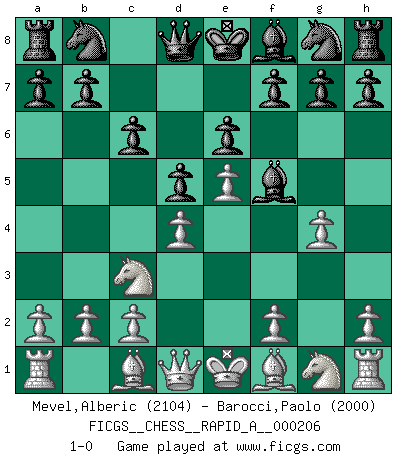 Last move : 1-0 2018 January 16 11:26:6 [Event "FICGS__CHESS__RAPID_A__000206"] [Site "FICGS"] [Date "2017.12.03"] [Round "1"] [White "Mevel,Alberic"] [Black "Barocci,Paolo"] [Result "1-0"] [WhiteElo "2104"] [BlackElo "2000"] 1.e4 c6 2.d4 d5 3.e5 Bf5 4.Nc3 e6 5.g4 1-0 This chess game has been lost on time (started : 2017.12.03 10:35:47) Caro-Kann : Advance variation Player White won this chess game. Follow this game move after move (download)When asked, -How is that you pick better moves than your opponents?, I responded: I'm very glad you asked me that, because, as it happens, there is a very simple answer. I think up my own moves, and I make my opponent think up his. (Alexander Alekhine) Wenn Dein Gegner dir ein Remis anbietet, versuch herauszufinden, weshalb er glaubt schlechter zu stehen. (Nigel Short) Después de la respuesta de las negras a 1.e4 con 1..e5, se quedan siempre tratando de entrar dentro del juego. (Howard Staunton) Le joueur d'Echecs qui veut atteindre le top est obligé de développer son propre credo créatif. Alexeï Stepanovicth Souétine. Il est facile d'écrire des livres ! Ce qui est difficile, c'est de jouer ! (Alexeï Stepanovicth Souétine) When you've done things right people won't know you've done anything at all. (Futurama)