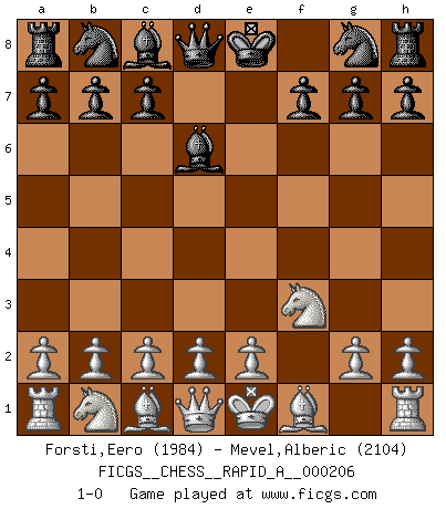 Last move : 1-0 2018 January 5 21:45:44 [Event "FICGS__CHESS__RAPID_A__000206"] [Site "FICGS"] [Date "2017.12.03"] [Round "1"] [White "Forsti,Eero"] [Black "Mevel,Alberic"] [Result "1-0"] [WhiteElo "1984"] [BlackElo "2104"] 1.f4 e5 2.fxe5 d6 3.exd6 Bxd6 4.Nf3 1-0 Bird : From gambit Player White won this chess game. Follow this game move after move (download)After a bad opening, there is hope for the middle game. After a bad middle game, there is hope for the endgame. But once you are in the endgame, the moment of truth has arrived. (Edmar Mednis) Schon mancher Spieler hat aufgegeben, um zu vermeiden, daß er eine Figur verliert. (Savielly Grigorievitsch Tartakower) El Ajedrez se juega con la mente... ¡no con las manos!. (Renaud y Kahn) Les erreurs sont comme les malheurs, elles n'arrivent jamais seules. (Siegbert Tarrasch) If you have any trouble condescending, find a Unix user to show you how it's done. (Scott Adams)