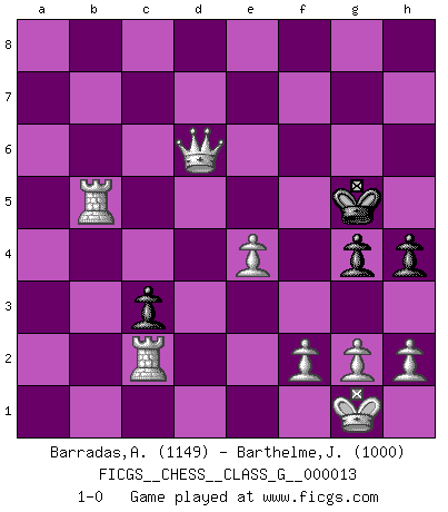 Last move : 1-0 2007 May 30 14:29:17 [Event "FICGS__CHESS__CLASS_G__000013"] [Site "FICGS"] [Date "2007.04.17"] [Round "1"] [White "Barradas,Anderson"] [Black "Barthelme,Jean Eudes"] [Result "1-0"] [WhiteElo "1149"] [BlackElo "1000"] 1.e4 e5 2.Nf3 Nc6 3.Bc4 Bc5 4.c3 Na5 5.Nxe5 d6 6.Nxf7 Qf6 7.O-O g6 8.Nxh8 Qxh8 9.Qa4+ Bd7 10.Qxa5 b6 11.Qa6 Qe5 12.Qb7 Rc8 13.d4 Bxd4 14.cxd4 Qg7 15.Re1 Nh6 16.Bxh6 Qxh6 17.Nc3 Qd2 18.Nb5 Kd8 19.Nxa7 Qxd4 20.Bb5 Qg7 21.Bxd7 Qxd7 22.Nxc8 Qxc8 23.Qxc8+ Kxc8 24.b4 h5 25.a4 c5 26.bxc5 bxc5 27.Reb1 c4 28.a5 c3 29.Ra2 g5 30.Rc2 Kd7 31.a6 g4 32.a7 h4 33.a8Q Ke6 34.Qd5+ Kf6 35.Qxd6+ Kg5 36.Rb5+ 1-0 Giuoco Piano Kingside Castling by player White (move 7) Promotion Queen by player White (move 33) Player White won this chess game. Follow this game move after move (download)Winning isn't everything... but losing is nothing. (Mednis) Schach ist ein Kampf gegen den Fehler. (Johannes Herrman Zukertort) La belleza de un movimiento no se refleja solo en su apariencia, sino en el pensamiento detrás de él. (Siegbert Tarrasch) Un footballeur joue avec ses pieds, parfois avec sa tête. Un joueur d'échecs ne joue qu'avec sa tête. Et quand il ne joue plus, il meurt. (Jacob Murray) Over-the-board chess is the favorite of mortals, correspondence chess is the favorite of the gods. (Eduard Dyckhoff)