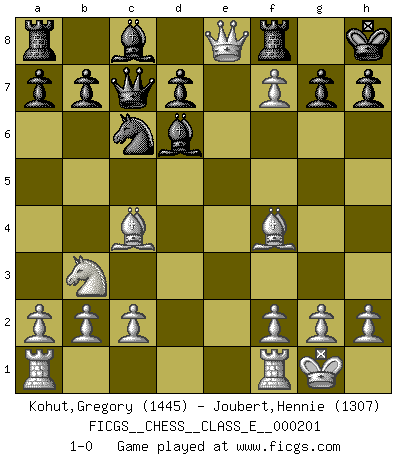 Last move : 1-0 2018 March 20 8:7:16 [Event "FICGS__CHESS__CLASS_E__000201"] [Site "FICGS"] [Date "2017.12.05"] [Round "1"] [White "Kohut,Gregory"] [Black "Joubert,Hennie"] [Result "1-0"] [WhiteElo "1445"] [BlackElo "1307"] 1.e4 c5 2.Nf3 e6 3.d4 cxd4 4.Nxd4 Nf6 5.Nc3 Qb6 6.e5 Nd5 7.Nxd5 exd5 8.Nb3 Nc6 9.Qxd5 Be7 10.Bc4 O-O 11.O-O Qc7 12.Bf4 Nb4 13.Qe4 Nc6 14.e6 Bd6 15.exf7+ Kh8 16.Qe8 1-0 Sicilian : Anderssen variation Kingside Castling by player Black (move 10) Kingside Castling by player White (move 11) Player White won this chess game. Follow this game move after move (download)If your opponent cannot do anything active, then don't rush the position; instead you should let him sit there, suffer, and beg you for a draw. (Jeremy Silman) Ich moechte nie einem Club beitreten, der Leute wie mich als Mitglieder aufnimmt. (Woody Allen) Una clavada es mas poderosa que una espada. (Fred Reinfeld) Pour se monter efficace, un Cavalier a besoin d'avant-postes ! Les Cavaliers font les meilleurs bloqueurs de pions passés. Life is pleasant. Death is peaceful. It's the transition that's troublesome. (Isaac Asimov)