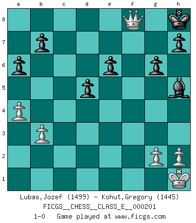 Last move : 1-0 2018 June 5 19:19:25 [Event "FICGS__CHESS__CLASS_E__000201"] [Site "FICGS"] [Date "2017.12.05"] [Round "1"] [White "Lubas,Jozef"] [Black "Kohut,Gregory"] [Result "1-0"] [WhiteElo "1499"] [BlackElo "1445"] 1.e4 c5 2.Nf3 Nc6 3.d4 cxd4 4.Nxd4 g6 5.c4 Nf6 6.Nc3 d6 7.f3 Bg7 8.Be3 O-O 9.Be2 Nxd4 10.Bxd4 Qa5 11.O-O Be6 12.f4 Rac8 13.b3 a6 14.Kh1 Rfd8 15.Rb1 Re8 16.a4 Qc7 17.Qd2 Qa5 18.Qe3 Ng4 19.Bxg4 Bxd4 20.Qxd4 Bxg4 21.f5 Bh5 22.f6 e6 23.Qd2 Kh8 24.e5 d5 25.Qh6 Rg8 26.cxd5 exd5 27.e6 fxe6 28.Rbe1 Qxc3 29.Rc1 Qd3 30.f7 Rgf8 31.Qg5 Qd4 32.Rxc8 Rxc8 33.Qh6 Qg7 34.f8Q+ Rxf8 35.Rxf8+ Qxf8 36.Qxf8+ 1-0 Sicilian : Accelerated Fianchetto, Maroczy bind Kingside Castling by player Black (move 8) Kingside Castling by player White (move 11) Promotion Queen by player White (move 34) Player White won this chess game. Follow this game move after move (download)Bobby is the most misunderstood, misquoted celebrity walking the face of this earth. (Yasser Seirawan) Ich weiss nicht was Gott gegen mich auf 1.e4 antworten würde. (Robert James Fischer) El Ajedrez es realmente noventa y nueve por ciento calculación. (Soltis) Le pion, dans sa simplicité, marche droit devant lui, mais lorsqu'il prend, il le fait obliquement? Ainsi l'homme, tant qu'il reste pauvre, marche dans la droiture et vit honnêtement, mais lorsqu'il recherche les honneurs, il flatte, se parjure et, par les voies obliques, cherche une position supérieure sur l'échiquier du monde. (Jean de Galles) Information on the Internet is subject to the same rules and regulations as conversation at a bar. (George Lundberg)