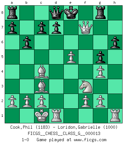 Last move : 1-0 2007 May 23 9:40:41 [Event "FICGS__CHESS__CLASS_G__000013"] [Site "FICGS"] [Date "2007.04.17"] [Round "1"] [White "Cook,Phil"] [Black "Loridon,Gabrielle"] [Result "1-0"] [WhiteElo "1183"] [BlackElo "1000"] 1.e4 e6 2.d4 h6 3.Nf3 Nf6 4.Nc3 Bd6 5.e5 Bb4 6.Bd2 Ng4 7.h3 Bxc3 8.Bxc3 b6 9.hxg4 Nc6 10.Qd2 Na5 11.O-O-O g6 12.d5 exd5 13.Qxd5 Ba6 14.Bxa6 g5 15.Bxa5 Rg8 16.Bc4 Rf8 17.Bc3 Rg8 18.Qxf7+ 1-0 French defense Queenside Castling by player White (move 11) Player White won this chess game. Follow this game move after move (download)No price is too great for the scalp of the enemy King. (Koblentz) Die westlichen Werte sind eine Sprache, welche die Putin-Administration nicht versteht. (Garry Kasparov) Muchos se han convertido en Maestros de Ajedrez, nadie se ha convertido en el Maestro del Ajedrez. (Siegbert Tarrasch) Je fais ceci parce que dans cinquante coups j'obtiendrai cela; je m'appelle Mikhail Moisevitch Botvinnik. (Botvinnik) Happy endings are just stories that haven't finished yet. (Jane Smith in Mr & Mrs Smith)