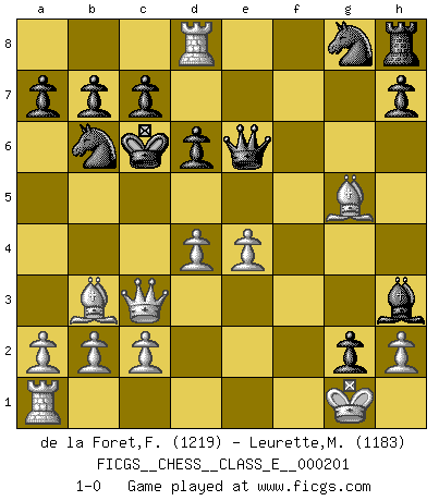 Last move : 1-0 2018 January 17 23:19:25 [Event "FICGS__CHESS__CLASS_E__000201"] [Site "FICGS"] [Date "2017.12.05"] [Round "1"] [White "de la Foret,Fred"] [Black "Leurette,Marc-Antoine"] [Result "1-0"] [WhiteElo "1219"] [BlackElo "1183"] 1.e4 e5 2.f4 exf4 3.Nf3 g5 4.Bc4 Bc5 5.d4 Bb6 6.O-O d6 7.Nc3 Bg4 8.Nd5 Nd7 9.Nxb6 Nxb6 10.Bb3 Qd7 11.Qd3 O-O-O 12.Nxg5 f3 13.Nxf7 fxg2 14.Rf2 Bh3 15.Nxd8 Kxd8 16.Rf8+ Ke7 17.Qf3 Qe6 18.Bg5+ Kd7 19.Rd8+ Kc6 20.Qc3+ 1-0 KGA : King's knight's gambit Kingside Castling by player White (move 6) Queenside Castling by player Black (move 11) Player White won this chess game. Follow this game move after move (download)A man without frontiers. He didn't divide the East and the West, he brought them together in their admiration for him. (Ljubomir Ljubojevic, about Bobby Fischer's death) Ja, ich habe einmal eine Blitzpartie gespielt, es war in einem Zug, 1929. --im Interview 1989 (Mikhail Moiseyevich Botvinik) Si el Ajedrez es una ciencia, es la mas inexacta. Si el Ajedrez es un arte, es demasiado inexacto para ser visto como tal. Si el Ajedrez es un deporte, es demasiado esotérico. Si el Ajedrez es un juego, es demasiado exigente para ser solo un juego. Si el Ajedrez es una aventura, es una muy demandante. Si el Ajedrez es una pasión, es una muy gratificante. Si el Ajedrez es la vida, es una muy triste. (Anónimo) On entre au jeu d'Echecs comme on entre en Religion. Pour le joueur d'Echecs, la partie d'Echecs c'est l'office, la messe, le défilé du 1er Mai, le dépôt de gerbe au Monument aux Morts. C'est un drame sacré. (Michel Roos) Computers are like Old Testament gods; lots of rules and no mercy. (Joseph Campbell)