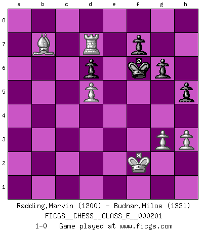 Last move : 1-0 2018 March 24 6:38:10 [Event "FICGS__CHESS__CLASS_E__000201"] [Site "FICGS"] [Date "2017.12.05"] [Round "1"] [White "Radding,Marvin"] [Black "Budnar,Milos"] [Result "1-0"] [WhiteElo "1200"] [BlackElo "1321"] 1.e4 c5 2.Nf3 d6 3.d4 cxd4 4.c3 Nf6 5.Bd3 dxc3 6.Nxc3 e5 7.O-O g6 8.Be3 Bg7 9.Qe2 O-O 10.Rfd1 Bg4 11.h3 Bxf3 12.Qxf3 Nc6 13.Rac1 Nd4 14.Bxd4 exd4 15.Nd5 Nxd5 16.exd5 Qf6 17.Qxf6 Bxf6 18.Rc7 b6 19.Rdc1 Be5 20.Ba6 Rfd8 21.Bb7 Rab8 22.Bc6 a5 23.g3 d3 24.b3 d2 25.Rd1 Bc3 26.Re7 Kg7 27.Re3 Bb4 28.a3 Bxa3 29.Rxd2 Bc1 30.Rde2 Bxe3 31.Rxe3 b5 32.Re4 Rdc8 33.Re7 Rd8 34.Ra7 a4 35.bxa4 bxa4 36.Rxa4 Rb1+ 37.Kg2 h5 38.Ra2 Rdb8 39.Re2 Rb8b2 40.Re7 Kf6 41.Rd7 Rxf2+ 42.Kxf2 Rb7+ 43.Bxb7 1-0 Sicilian Kingside Castling by player White (move 7) Kingside Castling by player Black (move 9) Player White won this chess game. Follow this game move after move (download)Chess is life. (Bobby Fischer) Schachspieler können ausgezeichnet Varianten am Schachbrett berechnen, aber nicht im realen Leben. Zu stark ist der Individualismus im Schach ausgeprägt, und für viele ist ein kleiner momentaner persönlicher Vorteil wichtiger als ein weit größerer Vorteil von morgen. (Anatoly Karpov) Los Peones son nacidos libres, y aún así, se encuentran encadenados por todos lados. (Rick Kennedy) Shah mat. Le roi est mort. Cri de fierté d'un joueur venant de terrasser son adversaire, courtoisement, sans effusion de sang. Looking at the proliferation of personal web pages on the Net, it looks like very soon everyone on Earth will have 15 megabytes of fame. (M.G. Sriram)