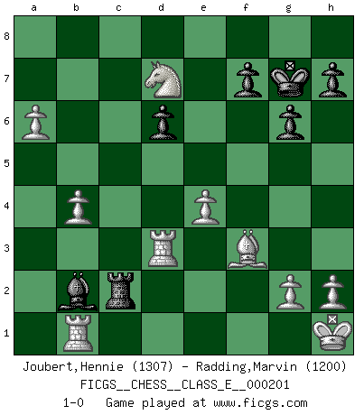 Last move : 1-0 2018 February 21 18:9:54 [Event "FICGS__CHESS__CLASS_E__000201"] [Site "FICGS"] [Date "2017.12.05"] [Round "1"] [White "Joubert,Hennie"] [Black "Radding,Marvin"] [Result "1-0"] [WhiteElo "1307"] [BlackElo "1200"] 1.e4 c5 2.Nf3 d6 3.d4 cxd4 4.Nxd4 Nf6 5.Nc3 g6 6.f4 Nc6 7.Be2 Bg7 8.O-O O-O 9.Be3 Bd7 10.Bf3 Rc8 11.a3 Na5 12.Qe2 a6 13.Rfd1 b5 14.Nd5 Nc4 15.Bc1 e6 16.Nxf6+ Bxf6 17.b3 Nb6 18.Bb2 Qe7 19.Qf2 e5 20.Ne2 Rxc2 21.Qxb6 Rxb2 22.b4 exf4 23.Nxf4 Qe5 24.Nd5 Bg7 25.Rac1 Bh6 26.Rb1 Ra2 27.Qxa6 Rc8 28.Nb6 Rc6 29.Qa8+ Kg7 30.Nxd7 Qg5 31.Qxc6 Qe3+ 32.Kh1 Bf4 33.Qxb5 Rf2 34.Qd3 Qxd3 35.Rxd3 Rc2 36.a4 Bc1 37.a5 Bb2 38.a6 1-0 Sicilian : Dragon, Levenfish variation Kingside Castling by player White (move 8) Kingside Castling by player Black (move 8) Player White won this chess game. Follow this game move after move (download)Human affairs are like a Chess game: only those who do not take it seriously can be called good players. (Hung Tzu Ch'eng) Matt entspricht nicht immer den Tatsachen. (Savielly Grigorievitsch Tartakower) Preferería tener un Peón que un dedo. (Reuben Fine) Tout change constamment, y compris dans le monde des Echecs. (Botvinnik) The general who wins the battle makes many calculations in his temple before the battle is fought. The general who loses makes but few calculations beforehand. (Sun Tzu)