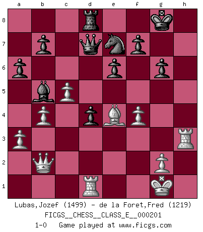 Last move : 1-0 2018 January 26 22:13:8 [Event "FICGS__CHESS__CLASS_E__000201"] [Site "FICGS"] [Date "2017.12.05"] [Round "1"] [White "Lubas,Jozef"] [Black "de la Foret,Fred"] [Result "1-0"] [WhiteElo "1499"] [BlackElo "1219"] 1.e4 c5 2.c3 d6 3.d4 Nf6 4.Bd3 e6 5.Nf3 Be7 6.O-O Nc6 7.Qe2 a6 8.dxc5 dxc5 9.e5 Nd5 10.c4 Ndb4 11.Be4 Nd4 12.Nxd4 cxd4 13.a3 Nc6 14.Bf4 O-O 15.Nd2 g6 16.Rad1 Qc7 17.Nf3 Rd8 18.h4 Bd7 19.h5 Be8 20.hxg6 hxg6 21.Ng5 Bxg5 22.Bxg5 Qxe5 23.Bxd8 Rxd8 24.f4 Qd6 25.b4 Ne7 26.c5 Qc7 27.Qb2 Bb5 28.Rf3 Qd7 29.Rh3 1-0 Sicilian : Alapin's variation (2.c3) Kingside Castling by player White (move 6) Kingside Castling by player Black (move 14) Player White won this chess game. Follow this game move after move (download)Every Chess master was once a beginner. (Chernev) Kostenjuk hat keinen Sexappeal. (Loek van Wely) Bobby Fischer es el jugador de Ajedrez mas grande que jamás haya existido. (Ken Smith) La conception d'un plan est le processus par lequel un joueur exploite les avantages de sa position tout en s'efforçant d'en réduire au minimum les inconvénients. Afin de garantir le succès, un plan doit toujours se fonder sur un diagnostic objectif des particularités d'une position. La conception d'un plan est d'autant plus difficile que la position est équilibrée, et grandement facilitée lorsqu'il n'existe qu'un seul plan susceptible de répondre aux exigences de la position. (Harry Golombek) The question of whether computers can think is just like question of whether submarines can swim. (Edsger W. Dijkstra)