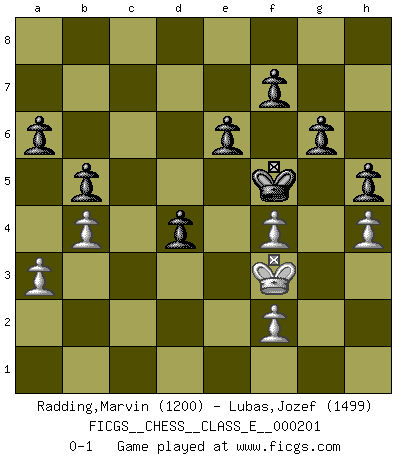 Last move : 0-1 2017 December 23 20:49:49 [Event "FICGS__CHESS__CLASS_E__000201"] [Site "FICGS"] [Date "2017.12.05"] [Round "1"] [White "Radding,Marvin"] [Black "Lubas,Jozef"] [Result "0-1"] [WhiteElo "1200"] [BlackElo "1499"] 1.e4 c5 2.Nf3 d6 3.d4 cxd4 4.c3 dxc3 5.Nxc3 Nc6 6.Bb5 a6 7.Ba4 b5 8.Bb3 Bb7 9.O-O e6 10.Be3 Nf6 11.Rc1 Na5 12.Bc2 Nc4 13.Bg5 Be7 14.b3 Na3 15.Qe2 Nxc2 16.Rxc2 Rc8 17.Rd1 Rxc3 18.Rxc3 Nxe4 19.Bxe7 Nxc3 20.Bxd8 Nxe2+ 21.Kf1 Bxf3 22.gxf3 Kxd8 23.Kxe2 Ke7 24.Rc1 Kd7 25.Kd3 Rc8 26.Rxc8 Kxc8 27.Kd4 Kd7 28.f4 Ke7 29.h4 Kf6 30.Ke4 h5 31.b4 d5+ 32.Ke3 Kf5 33.Kf3 d4 34.a3 g6 0-1 Sicilian Kingside Castling by player White (move 9) Player Black won this chess game. Follow this game move after move (download)You cannot play at Chess if you are kind-hearted. (French Proverb) Ich glaube nicht an Psychologie, ich glaube an gute Züge. (Robert James Fischer) El Ajedrez detiene a su maestro dentro de sus propios vínculos, encadenando la mente y el cerebro, por lo que la libertad interior del mas fuerte debe sufrir. (Albert Einstein) Il s'avisa de me proposer d'apprendre les échecs qu'il jouait un peu... me voilà forcené des échecs. J'achète un échiquier, je m'enferme dans ma chambre, j'y passe des jours et des nuits à vouloir apprendre par cur toutes les parties. (Jean-Jacques Rousseau, Confessions) May I never be complete. May I never be content. May I never be perfect. Deliver me, Tyler, from being perfect and complete. (Chuck Palahniuk, Fight Club)