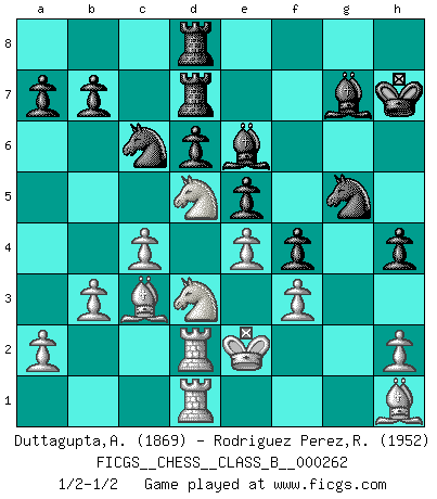 Last move : 1/2-1/2 2018 June 2 12:23:57 [Event "FICGS__CHESS__CLASS_B__000262"] [Site "FICGS"] [Date "2017.12.09"] [Round "1"] [White "Duttagupta,Aniruddha"] [Black "Rodriguez Perez,Rene"] [Result "1/2-1/2"] [WhiteElo "1869"] [BlackElo "1952"] 1.Nf3 Nf6 2.g3 g6 3.Bg2 Bg7 4.O-O O-O 5.c4 c5 6.d4 cxd4 7.Nxd4 Nc6 8.Nc2 d6 9.Nc3 Be6 10.b3 Qd7 11.Re1 Bh3 12.Bh1 h5 13.Rb1 h4 14.Bb2 Ng4 15.f3 Nf6 16.e4 Qd8 17.g4 e6 18.Qd2 Nh7 19.Rbd1 Qb6+ 20.Qe3 f5 21.gxf5 gxf5 22.Kf2 Qxe3+ 23.Nxe3 f4 24.Nc2 Rfd8 25.Re2 Rd7 26.Red2 Rad8 27.Ne1 Ng5 28.Ke2 Kh7 29.Nd3 e5 30.Nd5 Be6 31.Bc3 1/2-1/2 Reti : King's Indian attack Kingside Castling by player White (move 4) Kingside Castling by player Black (move 4) This chess game ended in a draw. Follow this game move after move (download)Bobby Fischer's current state of mind is indeed a tragedy. One of the world's greatest Chess players - the pride and sorrow of American Chess. (Frank Brady) Oft bringt ein stiller Zug das Erdbeben. (Richard Reti) Entre mas años cumplo, mas valoro los Peones. (Keres) Les Echecs sont affaire de jugement sensible. Savoir quand frapper et quand esquiver. (Fischer) Warrior pose battles inner weakness and wins focus. You see that there is no war within you. You're on your own side, and you are your own strength. (Terri Guillemets)
