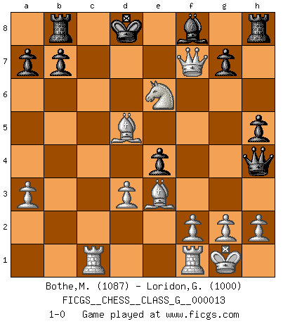Last move : 1-0 2007 July 31 18:11:37 [Event "FICGS__CHESS__CLASS_G__000013"] [Site "FICGS"] [Date "2007.04.17"] [Round "1"] [White "Bothe,Matthias"] [Black "Loridon,Gabrielle"] [Result "1-0"] [WhiteElo "1087"] [BlackElo "1000"] 1.e4 e5 2.Nf3 Nc6 3.Bc4 h5 4.O-O Nf6 5.Nc3 d6 6.d3 Bg4 7.Be3 Nb4 8.a3 Bxf3 9.Qxf3 Nxc2 10.Rac1 Nxa3 11.bxa3 d5 12.exd5 Nxd5 13.Bxd5 Qh4 14.Nb5 Rb8 15.Qxf7+ Kd8 16.Nxc7 e4 17.Ne6+ 1-0 King's pawn game Kingside Castling by player White (move 4) Player White won this chess game. Follow this game move after move (download)By this measure (on the gap between Fischer & his contemporaries), I consider him the greatest world champion. (Garry Kasparov) Wir können eben der zündenden Macht des Opfers nicht wiederstehen, denn die Begeisterung für das Opfer liegt in der Natur des Menschen. (Rudolf Spielmann) La batalla por la última verdad nunca sera ganada. Y es por eso que el Ajedrez es tan fascinante. (Hans Kmoch) En blitz, le Cavalier l'emporte sur le Fou. (Vlastimil Hort) 'preceded by its own quotation yields a falsehood' preceded by its own quotation yields a falsehood. (W. V. O. Quine - Set Theory And Its Logic, 1953)