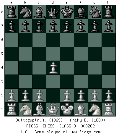 Last move : 1-0 2018 January 19 11:42:7 [Event "FICGS__CHESS__CLASS_B__000262"] [Site "FICGS"] [Date "2017.12.09"] [Round "1"] [White "Duttagupta,Aniruddha"] [Black "Aniky,Delfianto Roi"] [Result "1-0"] [WhiteElo "1869"] [BlackElo "1800"] 1.d4 1-0 This chess game has been lost on time (started : 2017.12.09 1:32:52) Queen's pawn Player White won this chess game. Follow this game move after move (download)The enormous mental resilience, without which no Chess player can exist, was so much taken up by Chess that he could never free his mind of this game. (Albert Einstein) Ich erzeugte keinen Neid, da mich die Schachspieler als Musiker und die Musiker als Schachspieler betrachteten. (Mark Taimanov) El Ajedrez hace al hombre ser mas sabio y ver mas claro. (Vladimir Putin) Les Cavaliers se révèlent fort utiles dans les positions fermées. D'habitude, les Fous sont un peu plus forts que les Cavaliers dans les positions ouvertes. Qu'on le veuille ou non, il restera toujours des exceptions ! Patience, use the Force, think ! (Obi-Wan Kenobi in Star Wars ep.2)