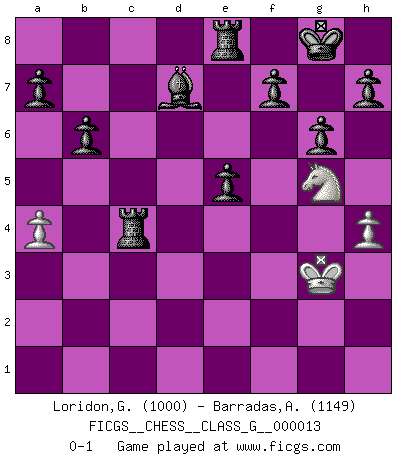 Last move : 0-1 2007 October 19 13:13:42 [Event "FICGS__CHESS__CLASS_G__000013"] [Site "FICGS"] [Date "2007.04.17"] [Round "1"] [White "Loridon,Gabrielle"] [Black "Barradas,Anderson"] [Result "0-1"] [WhiteElo "1000"] [BlackElo "1149"] 1.d4 Nf6 2.a3 e6 3.Nc3 d5 4.h3 c5 5.dxc5 Bxc5 6.Bg5 O-O 7.e4 d4 8.e5 dxc3 9.exf6 Qxd1+ 10.Kxd1 Rd8+ 11.Kc1 cxb2+ 12.Kxb2 Bd4+ 13.Kb1 Bxa1 14.Kxa1 Rd1+ 15.Kb2 Rxf1 16.c4 Rxf2+ 17.Kc1 Rxg2 18.c5 Rxg5 19.h4 Rxc5+ 20.Kd1 b6 21.Rh2 g6 22.Nh3 Nd7 23.Rh1 Nxf6 24.Rf1 Ng4 25.a4 Ne3+ 26.Ke2 Nxf1 27.Kxf1 e5 28.Ng5 Bd7 29.Kf2 Rc4 30.Kg3 Re8 0-1 This chess game has been lost on time (started : 2007.04.17 23:36:28) Queen's pawn game Kingside Castling by player Black (move 6) Player Black won this chess game. Follow this game move after move (download)No one ever won a game by resigning. (Unknown) Der Schachmeister von Heute braucht Courage, einen Killerinstinkt, Ausdauer und Arroganz. (Larry Evans) Repentinamente, me resultaba obvio en mi analisis que yo había pasado por alto lo que Fischer había visto en el tablero con la mas grande facilidad. (Mikhail Botvinnik) Soyez une menace à chaque fois que vous vous asseyez pour jouer. (Ken Smith) Chess is as much a mystery as women. (Purdy)