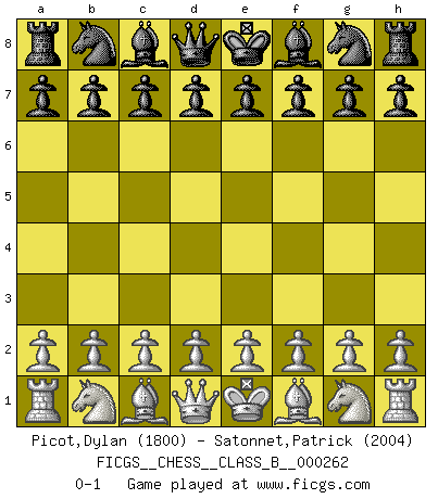 Last move : 0-1 2018 January 18 11:41:23 [Event "FICGS__CHESS__CLASS_B__000262"] [Site "FICGS"] [Date "2017.12.09"] [Round "1"] [White "Picot,Dylan"] [Black "Satonnet,Patrick"] [Result "0-1"] [WhiteElo "1800"] [BlackElo "2004"] 0-1 This chess game has been lost on time (started : 2017.12.09 1:32:52) Player Black won this chess game. Follow this game move after move (download)Fischer Chess play was always razor-sharp, rational and brilliant. One of the best ever. (Dave Regis) Verschiedene, sehr schätzbare und im Laufe des Lebens nützliche Eigenschaften des Geistes können durch das Schachspiel erworben und gekräftigt werden, so dass sie zu Gewohnheiten werden, die uns nie im Stich lassen. (Benjamin Franklin) El Ajedrez es una hermosa aventura. (Bent Larsen) Les échecs sont utiles à l'exercice de la faculté de penser et à celle de l'imagination. Car nous devons posséder une méthode élaborée pour atteindre des buts partout où nous devons conduire notre raison. (Leibnitz) Fortune favours the audacious. (Desiderius Erasmus)