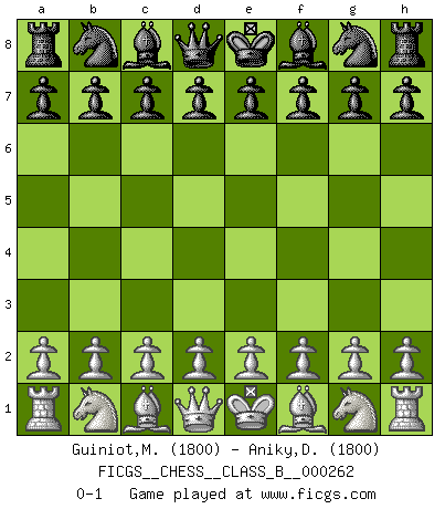 Last move : 0-1 2018 January 18 11:41:23 [Event "FICGS__CHESS__CLASS_B__000262"] [Site "FICGS"] [Date "2017.12.09"] [Round "1"] [White "Guiniot,Mickael"] [Black "Aniky,Delfianto Roi"] [Result "0-1"] [WhiteElo "1800"] [BlackElo "1800"] 0-1 This chess game has been lost on time (started : 2017.12.09 1:32:52) Player Black won this chess game. Follow this game move after move (download)You know, comrade Pachman, I don't enjoy being a Minister, I would rather play Chess like you. (Che Guevara) Das Zentrum ist der Balkan des Schachbretts - Kriegshandlungen können in jedem Moment ausbrechen. (Aaron Nimzowitsch) Debes de llevar a tu oponente hacia un profundo y obscuro bosque donde 2+2=5, y el camino que conduce a la salida es suficientemente ancho para solamente uno. (Mikhail Tal) Le moment que je préfère le plus dans une rencontre, c'est celui où je sens que la personnalité de l'adversaire se brise. (Robert Fischer) Watch your thoughts; they become words. Watch your words; they become actions. Watch your actions; they become habits. Watch your habits; they become character. Watch your character; it becomes your destiny. (Frank Outlaw)