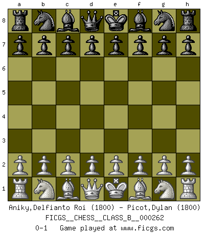 Last move : 0-1 2018 January 18 11:41:23 [Event "FICGS__CHESS__CLASS_B__000262"] [Site "FICGS"] [Date "2017.12.09"] [Round "1"] [White "Aniky,Delfianto Roi"] [Black "Picot,Dylan"] [Result "0-1"] [WhiteElo "1800"] [BlackElo "1800"] 0-1 This chess game has been lost on time (started : 2017.12.09 1:32:52) Player Black won this chess game. Follow this game move after move (download)Castle early and often. (Rob Sillars) Ich bewundere Kasparows phantasievolle Angriffssiege aus den Achtzigern und Neunzigern, aber wenn man sie mit dem Computer überprüft, nimmt der Computer in jeder zweiten Partie die Opfer an, verteidigt sich und gewinnt. (Vladimir Kramnik) Un entendimiento minucioso de las típicas continuaciones de mate hacen de las mas complicadas combinaciones de sacrificio que conducen hacia ellas no solo no dificiles, sino casi un asunto de rutina. (Siegbert Tarrasch) Un journaliste : 'Vous préférez avoir une dame de plus sur l'échiquier ou au lit ?' Boris Spassky : 'Ca dépend de la position.' . 'gn is not allowed in chess unless n is an integer between 1 and 8 inclusive, where 1 and 8 are to interpreted as the standard numerals standing for integers in the ordered real-closed field R, with the *canonical* ordering. (As opposed to, say, an integer in the domain Z[2+i*sqrt(5)] or an integer in some exotic Grothendieck topos). (Normajean Yates)