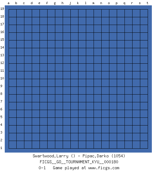Last move : 0-1 2018 February 20 2:40:34 [Event "FICGS__GO__TOURNAMENT_KYU__000180"] [Site "FICGS"] [Date "2018.01.21"] [Round "1"] [Black "Swartwood,Larry"] [White "Pipac,Darko"] [Result "0-1"] [Rating 2 "1054"] 0-1 This go game has been lost on time (started : 2018.01.21 0:10:37) Here are the names of the openings (joseki) played in the four corners : Player White won this Go (weiqi, baduk) game. Follow this game move after move (download)A knight's move near the edge of the board cannot be cut. (Bill Taylor) All battles are fought by scared men who'd rather be someplace else. (John Wayne in the movie In harm's way)