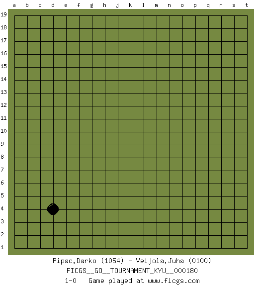 Last move : 1-0 2018 February 20 14:47:2 [Event "FICGS__GO__TOURNAMENT_KYU__000180"] [Site "FICGS"] [Date "2018.01.21"] [Round "1"] [Black "Pipac,Darko"] [White "Veijola,Juha"] [Result "1-0"] [Rating 1 "1054"] [Rating 2 "0100"] 1.d4 1-0 This go game has been lost on time (started : 2018.01.21 0:12:5) Here are the names of the openings (joseki) played in the four corners : Corner d4 : d4 1-0 Hoshi (Hwajeom, Seongjeom, Xingwei`) 4-4 Point. The star or hoshi (4-4) point, emphasizing influence at the potential expense of territory. Player Black won this Go (weiqi, baduk) game. Follow this game move after move (download)When your opponent is thick, you must also become thick. (Otake Hideo, 9p) As a goal marker shodan is important. As a destination it is a poor place to stop. (Thomas Tamayo)