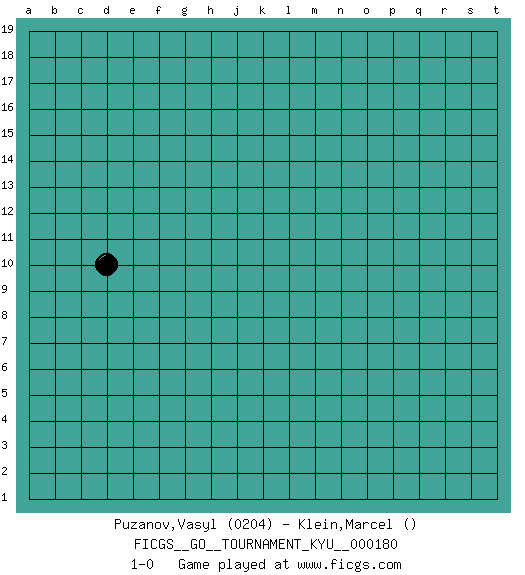 Last move : 1-0 2018 January 17 23:35:21 [Event "FICGS__GO__TOURNAMENT_KYU__000180"] [Site "FICGS"] [Date "2017.12.09"] [Round "1"] [Black "Puzanov,Vasyl"] [White "Klein,Marcel"] [Result "1-0"] [Rating 1 "0204"] 1.d10 1-0 This go game has been lost on time (started : 2017.12.09 11:49:23) Here are the names of the openings (joseki) played in the four corners : Player Black won this Go (weiqi, baduk) game. Follow this game move after move (download)The rectangular six is normally alive. (Anonymous) There's no money in correspondence chess. (John Knudsen)
