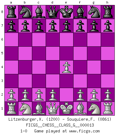Last move : 1-0 2007 April 21 13:28:55 [Event "FICGS__CHESS__CLASS_G__000013"] [Site "FICGS"] [Date "2007.04.17"] [Round "1"] [White "Litzenburger,Xavier"] [Black "Souquiere,Florence"] [Result "1-0"] [WhiteElo "1200"] [BlackElo "0861"] 1.e4 1-0 King's pawn Opening Player White won this chess game. Follow this game move after move (download)Look at Garry Kasparov. After he loses, invariably he wins the next game. He just kills the next guy. That's something that we have to learn to be able to do. (Maurice Ashley) Wenn Du absolut nicht mehr weißt, was Du tun sollst, dann ist es Zeit für Panik. (John van der Wiel) La enorme capacidad mental, en la que sin ella no puede un jugador de Ajedrez existir, es demasiado requerida por el Ajedrez al grado de que nunca podrá liberar su mente de este juego. (Albert Einstein) C'est une question de caractère, Beaucoup de gens perdent leur motivation très vite. D'autres, ils sont rares, peuvent la conserver très longtemps. J'aime les échecs, encore aujourd'hui je suis heureux d'analyser des parties. J'aime toujours gagner, je déteste encore perdre. Bien jouer est important pour mon intégrité intellectuelle et morale. Et puis les échecs vivent en ce moment une période historique grâce à Internet. Ils se développent dans les systèmes éducatifs à travers le monde. Ils sortent de leur ghetto, et c'est mon rôle de mener à bien cette révolution. (Gary Kasparov) The next best thing to gambling and winning is gambling and loosing. (Nick Dandalos)