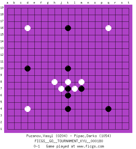 Last move : 0-1 2018 January 20 23:44:44 [Event "FICGS__GO__TOURNAMENT_KYU__000180"] [Site "FICGS"] [Date "2017.12.09"] [Round "1"] [Black "Puzanov,Vasyl"] [White "Pipac,Darko"] [Result "0-1"] [Rating 1 "0204"] [Rating 2 "1054"] 1.k4 q16 2.q4 d16 3.k10 d4 4.d10 h8 5.k16 m8 6.m7 k8 7.k7 j7 8.k6 l7 0-1 This go game has been lost on time (started : 2017.12.09 11:49:23) Here are the names of the openings (joseki) played in the four corners : Corner q4 : q4 m8 Hoshi (Hwajeom, Seongjeom, Xingwei`) 4-4 Point. The star or hoshi (4-4) point, emphasizing influence at the potential expense of territory. Player White won this Go (weiqi, baduk) game. Follow this game move after move (download)You don't have to be really good anymore to get good results. What's happening with chess is that it's gradually losing its place as the par excellence of intellectual activity. Smart people in search of a challenging board game might try a game called Go. (Hans Berliner, The New York Times, 2003) There are more things in heaven and earth than practically anywhere else. (Unknown)