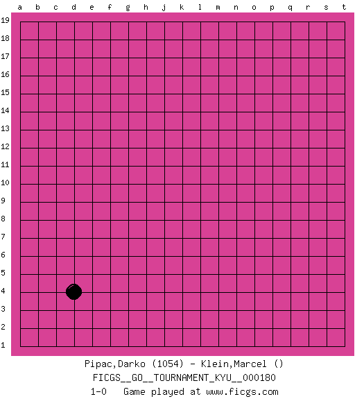 Last move : 1-0 2018 January 8 22:40:51 [Event "FICGS__GO__TOURNAMENT_KYU__000180"] [Site "FICGS"] [Date "2017.12.09"] [Round "1"] [Black "Pipac,Darko"] [White "Klein,Marcel"] [Result "1-0"] [Rating 1 "1054"] 1.d4 1-0 This go game has been lost on time (started : 2017.12.09 11:49:23) Here are the names of the openings (joseki) played in the four corners : Corner d4 : d4 1-0 Hoshi (Hwajeom, Seongjeom, Xingwei`) 4-4 Point. The star or hoshi (4-4) point, emphasizing influence at the potential expense of territory. Player Black won this Go (weiqi, baduk) game. Follow this game move after move (download)In opponents' sphere of influence, avoid sharp conflict, don't move too deep. (Otake Hideo, 9p) When you stop learning you start dying. (M. Scott Adams)