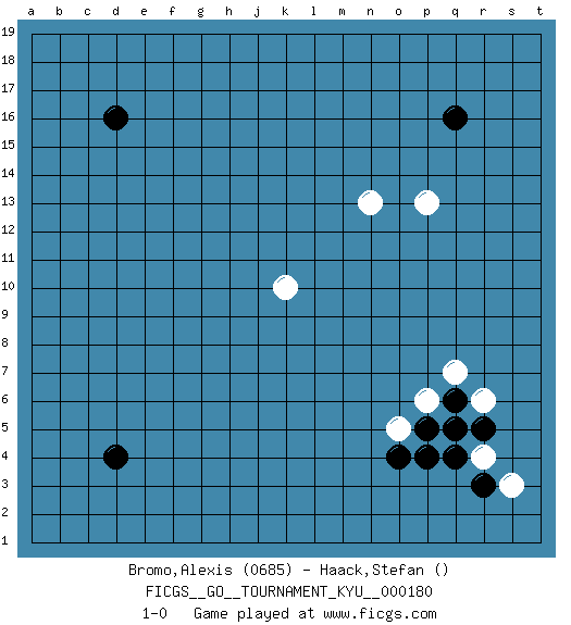Last move : 1-0 2018 January 18 20:40:19 [Event "FICGS__GO__TOURNAMENT_KYU__000180"] [Site "FICGS"] [Date "2017.12.09"] [Round "1"] [Black "Bromo,Alexis"] [White "Haack,Stefan"] [Result "1-0"] [Rating 1 "0685"] 1.q16 p13 2.d16 n13 3.q4 k10 4.d4 p6 5.p5 o5 6.o4 q5 7.p4 r4 8.r3 s3 9.r5 r6 10.q6 q7 11.q5 1-0 Here are the names of the openings (joseki) played in the four corners : Corner q16 : q16 p13 Hoshi (Hwajeom, Seongjeom, Xingwei`) 4-4 Point. The star or hoshi (4-4) point, emphasizing influence at the potential expense of territory. Corner q4 : q4 p6 Hoshi (Hwajeom, Seongjeom, Xingwei`) 4-4 Point. The star or hoshi (4-4) point, emphasizing influence at the potential expense of territory. Player Black won this Go (weiqi, baduk) game. Follow this game move after move (download)To emphasize the lack of determination in his moves, one speaks of chance. (Pierre Audouard) The production of too many useful things results in too many useless people. (Karl Marx)