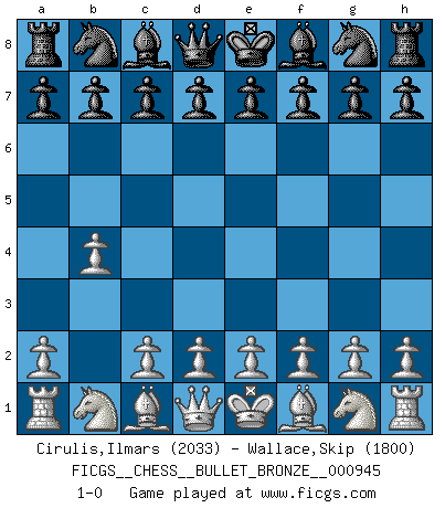 Last move : 1-0 2017 December 11 19:48:45 [Event "FICGS__CHESS__BULLET_BRONZE__000945"] [Site "FICGS"] [Date "2017.12.11"] [Round "1"] [White "Cirulis,Ilmars"] [Black "Wallace,Skip"] [Result "1-0"] [WhiteElo "2033"] [BlackElo "1800"] 1.b4 1-0 This chess game has been lost on time (started : 2017.12.11 13:51:23) Polish (Sokolsky) opening Player White won this chess game. Follow this game move after move (download)If cunning alone were needed to excel, women would be the best Chess players. (Albin) Der Verteidiger gebe der Gewalt nach, aber nur der Gewalt. Er schaffe sich nicht freiwillig, etwa aus Blindheit oder aus Schrecken, irgendwelche Schwächen. Er lasse sich nicht bluffen. (Emanuel Lasker) Fischer era un maestro de claridad y un Rey del posicionamiento astuto. Sus oponentes podían ver hacia donde se dirigía pero eran impotentes para detenerlo. (Bruce Pandolfini) Le pion, dans sa simplicité, marche droit devant lui, mais lorsqu'il prend, il le fait obliquement? Ainsi l'homme, tant qu'il reste pauvre, marche dans la droiture et vit honnêtement, mais lorsqu'il recherche les honneurs, il flatte, se parjure et, par les voies obliques, cherche une position supérieure sur l'échiquier du monde. (Jean de Galles) Art is not a thing, it is a way. (Elbert Hubbard)
