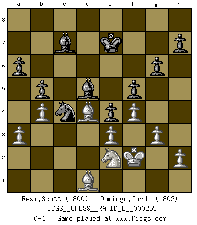 Last move : 0-1 2018 May 10 22:59:11 [Event "FICGS__CHESS__RAPID_B__000255"] [Site "FICGS"] [Date "2018.01.12"] [Round "1"] [White "Ream,Scott"] [Black "Domingo,Jordi"] [Result "0-1"] [WhiteElo "1800"] [BlackElo "1802"] 1.d4 d5 2.Nf3 c5 3.c4 dxc4 4.e3 Nf6 5.Bxc4 e6 6.O-O a6 7.dxc5 Qxd1 8.Rxd1 Bxc5 9.b3 b6 10.Bb2 Bb7 11.Ne5 Nc6 12.Nxc6 Bxc6 13.Be2 Ke7 14.Nc3 Rhd8 15.g3 g6 16.Rac1 Rxd1+ 17.Rxd1 Nd7 18.a3 b5 19.b4 Bd6 20.Rc1 f5 21.f4 Rc8 22.Kf2 Bb7 23.Na2 Rxc1 24.Nxc1 e5 25.Nd3 e4 26.Nc1 Bd5 27.Bd4 Bc7 28.Bd1 Nb6 29.Ne2 Nc4 0-1 This chess game has been lost on time (started : 2018.01.12 15:41:54) Queen's pawn game, Krause variation Kingside Castling by player White (move 6) Player Black won this chess game. Follow this game move after move (download)There's never before been a Chess player with such a thorough knowledge of the intricacies of the game and such an absolutely indomitable will to win. I think Bobby is the greatest player that ever lived. (Lisa Lane) Obendrein hat der FIDE-Präsident den Revolutionsführer Gaddafi zum »Großmeister« ernannt, am Ende der WM. Das ist lächerlich! (Joel Lautier) Tu no necesitas jugar muy bien, únicamente ayudar a tu oponenet a que juegue muy mal. (Genrikh Chepukaitis) Je ne crois pas en la psychologie, je crois aux bons coups. (Robert Fischer) A belief is an idea the mind possesses, an idea that possesses the mind. (Robert Oxden Bolton)