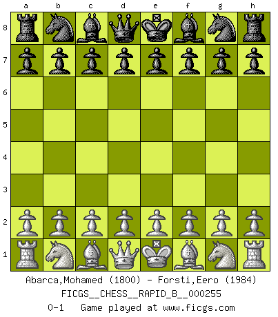 Last move : 0-1 2018 March 18 17:46:41 [Event "FICGS__CHESS__RAPID_B__000255"] [Site "FICGS"] [Date "2018.02.16"] [Round "1"] [White "Abarca,Mohamed"] [Black "Forsti,Eero"] [Result "0-1"] [WhiteElo "1800"] [BlackElo "1984"] 0-1 This chess game has been lost on time (started : 2018.02.16 14:51:53) Player Black won this chess game. Follow this game move after move (download)Whoever sees no other aim in the game than that of giving checkmate to one's opponent will never become a good Chess player. (Euwe) Wenn ich Weiß habe gewinne ich weil ich Weiß habe, wenn ich Schwarz habe gewinne ich weil ich Bogoljubov bin. (Efim Bogoljubov) El Ajedrez es imaginación. (David Bronstein) Aux échecs, l'amour-propre est satisfait quand on remporte la victoire, mais il n'y a pas de honte à être battu. (Benjamin Franklin) Yoga is 99% practice and 1% knowledge. (Sri Krishna Pattabhi Jois)
