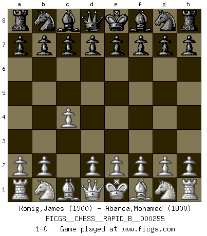 Last move : 1-0 2018 March 18 17:46:41 [Event "FICGS__CHESS__RAPID_B__000255"] [Site "FICGS"] [Date "2018.02.16"] [Round "1"] [White "Romig,James"] [Black "Abarca,Mohamed"] [Result "1-0"] [WhiteElo "1900"] [BlackElo "1800"] 1.c4 1-0 This chess game has been lost on time (started : 2018.02.16 14:51:53) English Opening Player White won this chess game. Follow this game move after move (download)Only sissies Castle. (Rob Sillars) Über Kasparov: Es ist offensichtlich, daß er in einem totalitären Staat aufwuchs und deshalb zu diktatorischen Zügen neigt. (Viktor Kortschnoi) ¿Se han dado cuenta de que Fischer casi nunca ha tenido piezas malas? El las intercambia y las piezas malas se quedan con sus oponenets. (Yuri Balashov) Il n'y a pas eu de défaite parce que je ne crois pas que cet ordinateur ait jamais existé. IBM a triché en refusant d'imprimer les modes de recherche de la machine. C'est évident, pendant le match, des coups décisifs ont été joués par des êtres humains. Aujourd'hui, les meilleurs spécialistes en informatique ne peuvent toujours pas expliquer comment Deep-Blue a pu jouer contre la logique des ordinateurs. IBM a gagné une guerre de communication, mais ils sont incapables de prouver que l'ordinateur a gagné tout seul. (Garry Kasparov) Life is like internet, nothing interesting, but noone want to leave it. (Ilmars Cirulis)
