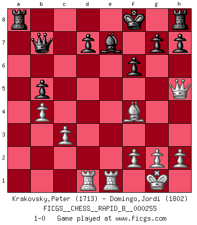 Last move : 1-0 2018 March 19 22:29:52 [Event "FICGS__CHESS__RAPID_B__000255"] [Site "FICGS"] [Date "2017.12.11"] [Round "1"] [White "Krakovsky,Peter"] [Black "Domingo,Jordi"] [Result "1-0"] [WhiteElo "1713"] [BlackElo "1802"] 1.d4 b5 2.e4 a6 3.Nf3 Bb7 4.Bd3 e6 5.O-O c5 6.c3 Nf6 7.e5 Nd5 8.dxc5 Bxc5 9.Nbd2 Nc6 10.a4 Qb8 11.Ne4 Be7 12.Re1 Nxe5 13.Nxe5 Qxe5 14.Nc5 Qc7 15.Nxb7 Qxb7 16.Be4 Rc8 17.axb5 axb5 18.Qf3 Kf8 19.Be3 f6 20.Rad1 Rc6 21.Bxd5 exd5 22.Qxd5 Rc7 23.Qh5 Rc8 24.Bf4 Ra8 25.b4 1-0 Polish defense Kingside Castling by player White (move 5) Player White won this chess game. Follow this game move after move (download)Chess is a part of culture and if a culture is declining then Chess too will decline. (Mikhail Botvinnik) Jeder Fehler erscheint unglaublich dumm, wenn andre ihn begehen. (Georg Christoph Lichtenberg) Un mal día en el Ajedrez, es mejor que cualquier buen día en el trabajo. (Anonymous) L'attaque fait le spectacle, la défense gagne les matchs. (Dicton footballistique) Luck never gives; it only lends. (Swedish proverb)