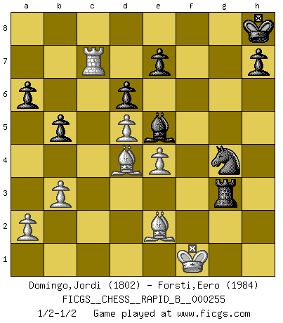 Last move : 1/2-1/2 2018 February 17 10:36:43 [Event "FICGS__CHESS__RAPID_B__000255"] [Site "FICGS"] [Date "2017.12.11"] [Round "1"] [White "Domingo,Jordi"] [Black "Forsti,Eero"] [Result "1/2-1/2"] [WhiteElo "1802"] [BlackElo "1984"] 1.e4 c5 2.Nf3 g6 3.d4 cxd4 4.Nxd4 Nc6 5.c4 Nf6 6.Nc3 d6 7.Be2 Nxd4 8.Qxd4 Bg7 9.Be3 O-O 10.Qd2 Be6 11.Rc1 Qa5 12.f3 Rfc8 13.b3 a6 14.Na4 Qxd2+ 15.Kxd2 Nd7 16.g4 f5 17.gxf5 gxf5 18.Rhg1 Kh8 19.Nc3 fxe4 20.fxe4 Nf6 21.Rg3 b5 22.Rcg1 Rg8 23.Bf3 Nd7 24.Nd5 Bxd5 25.cxd5 Be5 26.Rxg8+ Rxg8 27.Rc1 Bxh2 28.Rc7 Ne5 29.Be2 Rg2 30.Ke1 Ng4 31.Bd4+ Be5 32.Kf1 Rg3 1/2-1/2 Sicilian : Hungarian variation Kingside Castling by player Black (move 9) This chess game ended in a draw. Follow this game move after move (download)Whoever sees no other aim in the game than that of giving checkmate to one's opponent will never become a good Chess player. (Euwe) Wer sich die Fähigkeit anerziehen will im Schach selbstständig zu denken, der muß alles meiden, was leblos ist: ausgeklügelte Theorien, die sich auf sehr wenige Beispiele und eine Menge Hirngespinste stützen. (Emanuel Lasker) Cuando no sepas que mover, espera por una idea que se le venga a la la cabeza de tu oponente. Tenlo por seguro de que esa idea estará incorrecta. (Siegbert Tarrasch) La solitude du joueur d'Echecs à l'approche du mat est semblable à celle du condamné. (Francis Szpiner) All men can see these tactics whereby I conquer, but what none can see is the strategy out of which victory is evolved. (Sun Tzu)
