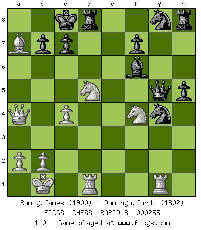 Last move : 1-0 2018 March 11 22:56:23 [Event "FICGS__CHESS__RAPID_B__000255"] [Site "FICGS"] [Date "2018.01.12"] [Round "1"] [White "Romig,James"] [Black "Domingo,Jordi"] [Result "1-0"] [WhiteElo "1900"] [BlackElo "1802"] 1.c4 g5 2.d4 h6 3.h4 g4 4.e4 Bg7 5.Nc3 d6 6.Be3 Nc6 7.Nge2 h5 8.Qc2 e5 9.dxe5 Bxe5 10.O-O-O Be6 11.Nd5 Qd7 12.f4 gxf3 13.gxf3 O-O-O 14.Rg1 Bh3 15.Bxh3 Qxh3 16.f4 Bf6 17.Kb1 Qxh4 18.e5 dxe5 19.fxe5 Nxe5 20.Nef4 Ng4 21.Bxa7 Qg5 22.Qa4 1-0 English Opening Queenside Castling by player White (move 10) Queenside Castling by player Black (move 13) Player White won this chess game. Follow this game move after move (download)Avoid the crowd. Do your own thinking independently. Be the Chess player, not the Chess piece. (Ralph Charell) Die meiste Zeit treffe ich auf Gegner, die meine Enkel sein könnten. Ich bin da, um ihnen zu zeigen, dass sie von mir noch einiges lernen können. (Viktor Kortschnoi) Nos gusta pensar. (Gary Kasparov) Ce qui est bien, c'est d'avoir tout un tas de pièces en prise : l'adversaire ne peut en prendre qu'une à la fois. Cité par Thierry Audin. But they are useless. They can only give you answers. (Pablo Picasso, about computers)