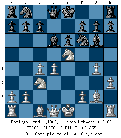Last move : 1-0 2018 January 25 23:56:11 [Event "FICGS__CHESS__RAPID_B__000255"] [Site "FICGS"] [Date "2017.12.11"] [Round "1"] [White "Domingo,Jordi"] [Black "Khan,Mahmood"] [Result "1-0"] [WhiteElo "1802"] [BlackElo "1700"] 1.e4 d5 2.exd5 Nf6 3.d4 Nxd5 4.Nf3 Bg4 5.h3 Bh5 6.c4 Nf6 7.Nc3 e6 8.g4 Bg6 9.Ne5 Bd6 10.Bg2 1-0 This chess game has been lost on time (started : 2017.12.11 15:12:16) Scandinavian : Marshall variation Player White won this chess game. Follow this game move after move (download)Best by test: 1. e4 (Bobby Fischer) Dein Körper muss in Topform sein. Dein Schach verfällt, wenn dein Körper verfällt. Der Körper kann nicht vom Geist getrennt werden. (Robert James Fischer) Dios mío, Bobby Fischer juega tan simple. (Alexei Suetin) C'est la seule position que je connaisse où les deux camps sont mals. Propos prêtés à V. Anand. CHESS, n. f. [echecs, Fr.] A nice and abstruse game, in which two sets of puppets are moved in opposition to each other. (Dr Samuel Johnson, A Dictionary Of The English Language, 1755)