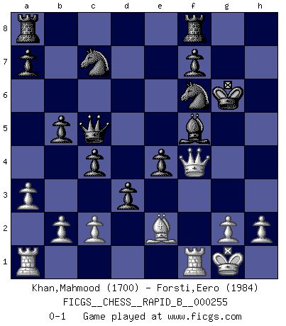 Last move : 0-1 2018 February 17 20:25:12 [Event "FICGS__CHESS__RAPID_B__000255"] [Site "FICGS"] [Date "2017.12.11"] [Round "1"] [White "Khan,Mahmood"] [Black "Forsti,Eero"] [Result "0-1"] [WhiteElo "1700"] [BlackElo "1984"] 1.e4 g6 2.d4 Bg7 3.Nf3 d6 4.Nc3 Nf6 5.Bg5 O-O 6.Bd3 c5 7.d5 h6 8.Bd2 e6 9.O-O Na6 10.a3 Nc7 11.Qc1 exd5 12.Bxh6 c4 13.Bxg7 Kxg7 14.e5 dxe5 15.Be2 d4 16.Na4 e4 17.Ne5 b5 18.Nc5 Qd6 19.Nxg6 Kxg6 20.f4 Qxc5 21.f5+ Bxf5 22.Qf4 d3 0-1 Robatsch (Modern) defense Kingside Castling by player Black (move 5) Kingside Castling by player White (move 9) Player Black won this chess game. Follow this game move after move (download)The Pin is mightier than the sword. (Fred Reinfeld) Ich tröste mich mit dem Vergnügen, daß Schachfans, Zuschauer und Leser glücklich sind, wenn ein Großmeister etwas riskiert, statt nur Klötzchen zu schieben. (Mikhail Nekhemyevich Tal) Las Aperturas te enseñan aperturas. ¡Los Finales te enseñan Ajedrez!. (Stephan Gerzadowicz) Pour moi, les échecs ne sont pas un jeu mais un art. (Alexandre Alekhine) Wisdom is the reward you get for a lifetime of listening when you'd have preferred to talk. (Doug Larson)