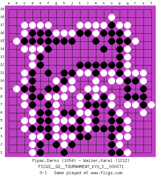Last move : 0-1 2018 February 11 11:17:22 [Event "FICGS__GO__TOURNAMENT_KYU_I__000071"] [Site "FICGS"] [Date "2017.12.11"] [Round "1"] [Black "Pipac,Darko"] [White "Walzer,Karel"] [Result "0-1"] [Rating 1 "1054"] [Rating 2 "1212"] 1.d4 q16 2.d16 q4 3.o17 m17 4.n16 m16 5.o15 q14 6.n14 j16 7.m15 f17 8.f16 e17 9.e16 g16 10.g15 h16 11.h15 c14 12.d10 d6 13.q10 q11 14.p11 r11 15.k4 c5 16.e5 c4 17.e6 c8 18.d8 d3 19.e4 e3 20.f3 c11 21.d11 c10 22.e2 d2 23.e1 l9 24.p4 q5 25.p5 p6 26.o6 o7 27.n7 n6 28.o5 o8 29.m7 n9 30.j15 p10 31.o12 o11 32.p12 n11 33.n12 l11 34.l12 k11 35.k12 k7 36.j11 p3 37.o3 n5 38.o4 l5 39.m5 p2 40.n4 l6 41.m6 l4 42.m4 k8 43.l3 g8 44.o2 q3 45.p1 q1 46.o1 h5 47.j6 j5 48.k5 k6 49.j4 g4 50.f4 g3 51.g2 h3 52.j2 h2 53.h1 j3 54.k3 g6 55.h6 g7 56.d7 c7 57.g9 h9 58.h10 g10 59.f9 j10 60.h11 j9 61.f11 c17 62.k16 k17 63.l16 l17 64.c9 b9 65.d9 d12 66.e12 d13 67.e13 e14 68.d15 d14 69.f14 c16 70.c15 b15 71.f7 f15 72.e15 d17 73.f15 p17 74.p16 q17 75.p14 q13 76.p13 o18 77.q15 r15 78.p15 q12 79.m11 m10 80.m12 o10 81.f6 f8 82.e8 d1 83.h4 g5 84.f5 h8 85.l8 m8 86.l7 n17 87.o16 d5 88.n8 m9 89.q9 r7 90.r8 q7 91.r10 s10 92.s9 s11 93.s7 s6 94.q8 t7 95.s8 pass 0-1 Here are the names of the openings (joseki) played in the four corners : Corner q16 : q16 o17 Hoshi (Hwajeom, Seongjeom, Xingwei`) 4-4 Point. The star or hoshi (4-4) point, emphasizing influence at the potential expense of territory. Ikken Kakari (Hankan Keolch'im, Yi Gua`jiao~, 1-Space Low Approach). Black 2 is the standard approach move to the 4-4. Corner d16 : d16 j16 Hoshi (Hwajeom, Seongjeom, Xingwei`) 4-4 Point. The star or hoshi (4-4) point, emphasizing influence at the potential expense of territory. Corner d4 : d4 d6 Hoshi (Hwajeom, Seongjeom, Xingwei`) 4-4 Point. The star or hoshi (4-4) point, emphasizing influence at the potential expense of territory. Ikken Takagakari (Hankan Nop'dakeolch'im, Yi Gaojia, 1-Space High Approach). Black typically responds at 6-4 or 3-10. Black 4-10 is played when Black finds play on the right side advantageous. Black 4-8 or 3-8 may be played when Black has support at top. Player White won this Go (weiqi, baduk) game. Follow this game move after move (download)In the opening, when you don't know what to play, make a shimari. (Jansteen) The general who wins the battle makes many calculations in his temple before the battle is fought. The general who loses makes but few calculations beforehand. (Sun Tzu)
