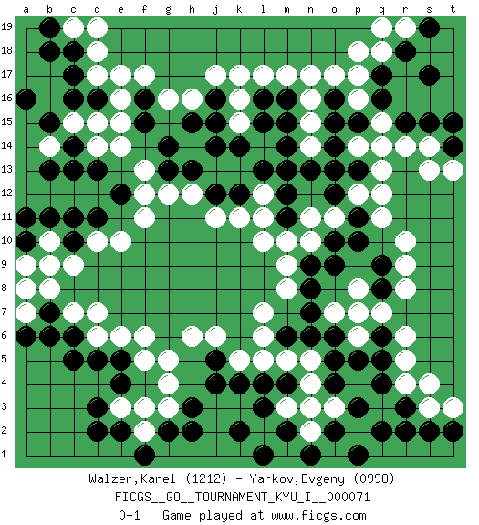 Last move : 0-1 2018 February 22 16:57:16 [Event "FICGS__GO__TOURNAMENT_KYU_I__000071"] [Site "FICGS"] [Date "2017.12.11"] [Round "1"] [Black "Walzer,Karel"] [White "Yarkov,Evgeny"] [Result "0-1"] [Rating 1 "1212"] [Rating 2 "0998"] 1.d3 d17 2.q16 r4 3.c5 c15 4.q4 r5 5.r3 s3 6.r2 o3 7.q5 r6 8.q6 q7 9.o6 p7 10.m4 p6 11.p5 n5 12.o5 n4 13.n6 m5 14.l4 m3 15.l3 l5 16.m2 n3 17.j4 l7 18.n8 l10 19.o9 r10 20.q9 r9 21.o12 n2 22.l1 o17 23.o16 n16 24.o15 p17 25.q17 p16 26.p15 n15 27.d16 e16 28.c16 q15 29.r15 q14 30.o14 r14 31.s15 s14 32.s17 q18 33.r18 d15 34.c17 e17 35.b15 b14 36.a16 k5 37.k4 h6 38.s2 j17 39.c18 g4 40.h3 g3 41.g2 f2 42.h2 f6 43.k2 n10 44.o10 m17 45.d13 e14 46.d11 c9 47.c14 c7 48.c10 b10 49.b11 d10 50.c11 n11 51.m13 o11 52.p11 p12 53.n13 q11 54.p10 m8 55.k12 j11 56.j12 h12 57.h13 g12 58.j16 h16 59.j15 k17 60.g13 f13 61.l15 k11 62.h15 l12 63.l13 d6 64.b6 e10 65.b13 r8 66.n9 p2 67.q2 s4 68.p3 g16 69.o4 f11 70.g14 d18 71.p1 k16 72.j14 k15 73.k14 p18 74.e2 e3 75.f1 f3 76.d2 b9 77.f15 e15 78.p13 q12 79.o2 q13 80.m12 l11 81.e4 g5 82.d5 m9 83.j5 j6 84.m11 m10 85.f16 f17 86.l16 l17 87.t14 t13 88.t15 s13 89.b7 b8 90.t2 t3 91.m6 l6 92.n1 c19 93.b19 d19 94.b18 o7 95.n7 e6 96.e5 f5 97.m15 d14 98.c13 a7 99.a10 a9 100.a11 n14 101.m14 p14 102.o13 r19 103.s19 q19 104.c6 d7 105.q8 p8 106.m16 n17 107.e12 f12 108.a6 a8 0-1 Here are the names of the openings (joseki) played in the four corners : Corner q4 : r4 q4 Komoku (Somok, Xiao~mu`) 3-4 Point. The komoku (3-4) point is the traditional corner enclosure move.. Player White won this Go (weiqi, baduk) game. Follow this game move after move (download)Everything would seem to be possible in Go. Like pulling a rabbit, by a magical move, out of a hat. (Pierre Audouard) There are 10 types of people in this world: those who understand binary and those who don't. (Anonymous)