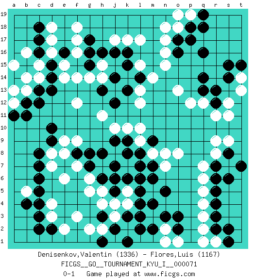 Last move : 0-1 2018 January 22 12:42:9 [Event "FICGS__GO__TOURNAMENT_KYU_I__000071"] [Site "FICGS"] [Date "2017.12.11"] [Round "1"] [Black "Denisenkov,Valentin"] [White "Flores,Luis"] [Result "0-1"] [Rating 1 "1336"] [Rating 2 "1167"] 1.q16 q4 2.c16 d4 3.c6 f3 4.d9 f17 5.e16 d18 6.c18 d17 7.c17 d16 8.d15 c15 9.d14 l17 10.r6 k17 11.o3 q2 12.r3 q3 13.r4 j3 14.l3 r9 15.r12 q5 16.r5 q6 17.r2 q7 18.n5 o8 19.b4 b5 20.c5 o13 21.q14 h11 22.c3 j8 23.o17 k4 24.l4 k5 25.l5 l13 26.m7 l6 27.m6 m8 28.l7 k7 29.l8 r1 30.s1 q12 31.q13 r11 32.r13 n2 33.o2 q1 34.s2 k2 35.l2 o1 36.n3 n7 37.m2 n1 38.m4 l9 39.k6 j6 40.l6 c14 41.d13 b16 42.b15 b14 43.c13 b13 44.b12 a15 45.c12 f16 46.m9 n8 47.k9 l10 48.k8 k10 49.j9 d3 50.c4 f14 51.h8 e6 52.h6 h5 53.j7 p12 54.j5 g5 55.k3 j4 56.j2 h2 57.k1 d7 58.c7 d8 59.c8 e9 60.d10 n16 61.o16 n15 62.j14 f12 63.h16 e15 64.l14 n17 65.h3 h4 66.h1 g2 67.s8 s7 68.r7 r8 69.s6 s9 70.t7 o18 71.p18 n18 72.p17 s11 73.d2 e2 74.c2 t14 75.s14 t13 76.t15 s12 77.s15 p19 78.q19 o19 79.q18 a12 80.a11 a13 81.b11 g6 82.g7 f7 83.f8 e8 84.j6 f9 85.g8 j10 86.k13 l12 87.k16 j17 88.j16 l15 89.k15 m14 90.h13 h15 91.g15 g14 92.j12 h14 93.g16 e14 94.g17 f18 0-1 Here are the names of the openings (joseki) played in the four corners : Corner d4 : d4 c6 Hoshi (Hwajeom, Seongjeom, Xingwei`) 4-4 Point. The star or hoshi (4-4) point, emphasizing influence at the potential expense of territory. Ikken Kakari (Hankan Keolch'im, Yi Gua`jiao~, 1-Space Low Approach). Black 2 is the standard approach move to the 4-4. Corner d16 : c16 f17 Komoku (Somok, Xiao~mu`) 3-4 Point. The komoku (3-4) point is the traditional corner enclosure move.. Niken Kakari (Dukan Keolch'im, E`r Gua`jiao~, 2-Space Low Approach). White 2 is used with friendly forces backing it up. Its purpose is to prevent a pincer. Locally it results in a loss, but may be appropriate fuseki strategy. It was popular in the late 1950s and early 1960s, but is not seen often nowadays, having been replaced by the one-space high approach, with which it has points in common. Corner q16 : q16 l17 Hoshi (Hwajeom, Seongjeom, Xingwei`) 4-4 Point. The star or hoshi (4-4) point, emphasizing influence at the potential expense of territory. Corner q4 : q4 r6 Hoshi (Hwajeom, Seongjeom, Xingwei`) 4-4 Point. The star or hoshi (4-4) point, emphasizing influence at the potential expense of territory. Ikken Kakari (Hankan Keolch'im, Yi Gua`jiao~, 1-Space Low Approach). Black 2 is the standard approach move to the 4-4. Player White won this Go (weiqi, baduk) game. Follow this game move after move (download)The simplest move is the best move. (Anonymous) Memory... is the diary that we all carry with us. (Oscar Wilde, The Importance of Being Earnest)