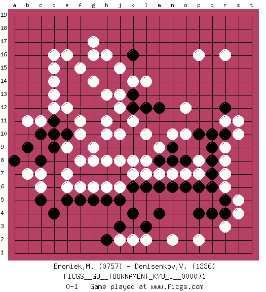 Last move : 0-1 2018 April 7 20:26:37 [Event "FICGS__GO__TOURNAMENT_KYU_I__000071"] [Site "FICGS"] [Date "2017.12.11"] [Round "1"] [Black "Broniek,Mariusz Maciej"] [White "Denisenkov,Valentin"] [Result "0-1"] [Rating 1 "0757"] [Rating 2 "1336"] 1.d4 d16 2.q4 r16 3.q10 c6 4.k4 e6 5.e5 g6 6.f5 f6 7.g5 j6 8.h5 h6 9.j5 p16 10.k16 r3 11.p4 s5 12.r4 s4 13.r5 r6 14.q6 r7 15.q7 r8 16.q8 r9 17.q9 s11 18.r10 s10 19.r12 l7 20.k6 k7 21.l6 m7 22.m6 g17 23.k10 h10 24.j7 j8 25.h7 k8 26.g7 f8 27.f7 e7 28.h9 h8 29.j9 g9 30.g10 h11 31.f9 g8 32.h12 k11 33.j11 j12 34.k12 j10 35.k9 l10 36.l9 m9 37.m8 l8 38.n8 j13 39.k13 k14 40.l12 l14 41.m12 o10 42.o8 o12 43.j14 j15 44.h14 h13 45.g12 g14 46.h15 h16 47.g15 f15 48.g13 g16 49.g11 f13 50.f12 f10 51.e13 e12 52.f14 f11 53.f13 d13 54.e14 d14 55.e15 e16 56.e10 d15 57.d9 e9 58.c8 c7 59.b9 c11 60.c10 b11 61.a8 b7 62.c5 p2 63.d11 d12 64.d10 n2 65.l3 l2 66.m4 k2 67.j3 j2 68.h2 n7 69.n6 o7 70.o6 p7 71.p6 p8 72.n9 n10 73.p10 r11 0-1 This go game has been lost on time (started : 2017.12.11 18:27:42) Here are the names of the openings (joseki) played in the four corners : Corner d4 : d4 c6 Hoshi (Hwajeom, Seongjeom, Xingwei`) 4-4 Point. The star or hoshi (4-4) point, emphasizing influence at the potential expense of territory. Ikken Kakari (Hankan Keolch'im, Yi Gua`jiao~, 1-Space Low Approach). White 2 is the standard approach move to the 4-4. Corner q4 : q4 r3 Hoshi (Hwajeom, Seongjeom, Xingwei`) 4-4 Point. The star or hoshi (4-4) point, emphasizing influence at the potential expense of territory. Player White won this Go (weiqi, baduk) game. Follow this game move after move (download)If White takes all four corners, Black should resign; if Black takes all four corners, Black should also resign. (David Kent) If things go wrong, don't go with them. (Roger Babson)