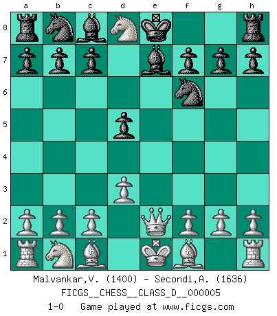 Last move : 1-0 2006 June 21 12:48:0 [Event "FICGS__CHESS__CLASS_D__000005"] [Site "FICGS"] [Date "2006.06.01"] [Round "1"] [White "Malvankar,Vikrant"] [Black "Secondi,Alberto"] [Result "1-0"] [WhiteElo "1400"] [BlackElo "1636"] 1.e4 e5 2.Nf3 Nf6 3.Nxe5 Nxe4 4.Qe2 d5 5.d3 Nf6 6.Nc6 Be7 7.Nxd8 1-0 Petrov : Damiano variation Player White won this chess game. Follow this game move after move (download)The blunders are all there on the board, waiting to be made. (Savielly Tartakover) Kombinieren und Schwarzhandel gehören verboten. (Savielly Grigorievitsch Tartakower) La estratégia requiere pensar, la táctica requiere observación. (Max Euwe) Seul un grand joueur sait à quel point il joue faiblement. (Xavier Tartacover) Man is reluctant to give credit for intelligence to anyone, except his enemies. (Albert Einstein)