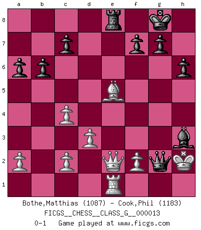 Last move : 0-1 2007 June 9 14:24:35 [Event "FICGS__CHESS__CLASS_G__000013"] [Site "FICGS"] [Date "2007.04.17"] [Round "1"] [White "Bothe,Matthias"] [Black "Cook,Phil"] [Result "0-1"] [WhiteElo "1087"] [BlackElo "1183"] 1.e4 e5 2.Nf3 Nf6 3.Nc3 Nc6 4.Bc4 h6 5.O-O Bb4 6.d3 Bxc3 7.bxc3 O-O 8.Ba3 Re8 9.Rb1 d5 10.exd5 Nxd5 11.Bxd5 Qxd5 12.c4 Qd8 13.Rb5 a6 14.Rd5 Qf6 15.h3 Be6 16.Rc5 Rad8 17.Re1 Bc8 18.Rd5 b6 19.Rxd8 Rxd8 20.Bb2 Re8 21.Qe2 Qg6 22.Nxe5 Nxe5 23.Bxe5 Bxh3 24.Kh2 Qxg2+ 0-1 Petrov Three knights game Kingside Castling by player White (move 5) Kingside Castling by player Black (move 7) Player Black won this chess game. Follow this game move after move (download)Chess is a terrible game. If you have no center, your opponent has a freer position. If you do have a center, then you really have something to worry about ! (Siegbert Tarrasch) Die unerbitterlichsten Regeln im Schach sind die Ausnahmen. (Savielly Grigorievitsch Tartakower) Una clavada es mas poderosa que una espada. (Fred Reinfeld) Tout change constamment, y compris dans le monde des Echecs. (Botvinnik) When you stop learning you start dying. (Scott Adams)