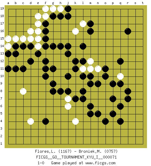 Last move : 1-0 2018 April 2 19:56:37 [Event "FICGS__GO__TOURNAMENT_KYU_I__000071"] [Site "FICGS"] [Date "2017.12.11"] [Round "1"] [Black "Flores,Luis"] [White "Broniek,Mariusz Maciej"] [Result "1-0"] [Rating 1 "1167"] [Rating 2 "0757"] 1.q4 d16 2.r16 d4 3.f17 k16 4.c14 c15 5.d14 d15 6.f14 e16 7.f16 e14 8.e13 e15 9.f15 e17 10.b14 b15 11.f12 d13 12.d12 c13 13.b13 c12 14.c11 b12 15.b11 a12 16.a11 a14 17.a13 a15 18.m16 k10 19.l14 q10 20.q12 e18 21.r8 k4 22.m10 c8 23.l8 k8 24.k7 l9 25.m9 m8 26.l7 m7 27.j8 k9 28.m6 n6 29.m5 n7 30.n5 o5 31.o4 o6 32.p5 p6 33.p9 p8 34.q9 o9 35.o10 n8 36.q6 q7 37.r7 q8 38.n9 o8 39.p7 o7 40.p7 m12 41.k12 j9 42.h8 h9 43.g9 j7 44.g8 j6 45.f4 g10 46.f10 h11 47.g11 h10 48.h12 j12 49.j13 j11 50.k11 l11 51.l12 h13 52.j14 g12 53.f11 g13 54.h14 f13 55.g14 h12 56.l10 m11 57.j10 l17 58.m17 f18 59.g18 g19 60.h18 h19 61.j19 f19 62.j18 n11 63.o11 1-0 This go game has been lost on time (started : 2017.12.11 18:27:42) Here are the names of the openings (joseki) played in the four corners : Corner d16 : d16 f17 Hoshi (Hwajeom, Seongjeom, Xingwei`) 4-4 Point. The star or hoshi (4-4) point, emphasizing influence at the potential expense of territory. Ikken Kakari (Hankan Keolch'im, Yi Gua`jiao~, 1-Space Low Approach). Black 2 is the standard approach move to the 4-4. Player Black won this Go (weiqi, baduk) game. Follow this game move after move (download)Learning josekis by heart is useless if you don't try departing from them. (Pierre Audouard) The only thing that overcomes hard luck is hard work. (Harry Golden)