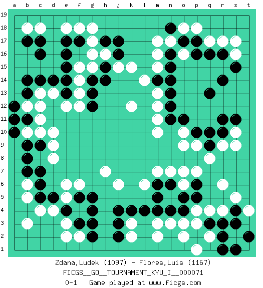 Last move : 0-1 2018 April 23 21:52:44 [Event "FICGS__GO__TOURNAMENT_KYU_I__000071"] [Site "FICGS"] [Date "2017.12.11"] [Round "1"] [Black "Zdana,Ludek"] [White "Flores,Luis"] [Result "0-1"] [Rating 1 "1097"] [Rating 2 "1167"] 1.q16 q4 2.c16 d4 3.j17 d13 4.e16 d10 5.r11 m2 6.f3 r9 7.q13 o9 8.r3 c10 9.j4 k2 10.j2 k3 11.j3 r4 12.q3 p3 13.p2 o2 14.s4 s5 15.s3 p4 16.r1 e3 17.f5 f2 18.g2 f4 19.g3 e5 20.g4 f6 21.e4 r17 22.r16 q17 23.p17 p18 24.o17 o18 25.n18 n17 26.n16 m17 27.n12 f4 28.g5 e2 29.k4 m16 30.n15 m15 31.n14 g17 32.h14 g15 33.c14 j15 34.h15 h16 35.j16 k15 36.g14 f15 37.e15 f14 38.g12 f13 39.g13 e18 40.e17 f18 41.d14 c18 42.c17 o16 43.p16 s16 44.s15 s17 45.r14 c13 46.b13 b12 47.b14 b18 48.b17 k12 49.f17 g18 50.e13 e12 51.e14 f12 52.b11 c12 53.a12 b10 54.a10 c11 55.b9 a11 56.e4 e6 57.b11 h7 58.a11 j6 59.n4 n3 60.l4 l6 61.m6 m7 62.n6 n7 63.p6 o6 64.o5 o7 65.p5 r6 66.o4 o3 67.m5 m11 68.n11 m10 69.c7 b6 70.c6 b5 71.d5 f4 72.h17 g16 73.e4 c4 74.b7 d8 75.c5 f4 76.c9 d9 77.b8 s10 78.s11 p1 79.t2 q2 80.r2 t4 81.s1 m13 82.n13 m12 83.r10 s9 84.p10 o10 85.o11 p9 86.q10 p7 87.e4 m3 88.m4 f4 89.m14 l14 90.e4 b3 91.q9 q8 0-1 Here are the names of the openings (joseki) played in the four corners : Corner d4 : d4 f3 Hoshi (Hwajeom, Seongjeom, Xingwei`) 4-4 Point. The star or hoshi (4-4) point, emphasizing influence at the potential expense of territory. Ikken Kakari (Hankan Keolch'im, Yi Gua`jiao~, 1-Space Low Approach). Black 2 is the standard approach move to the 4-4. Player White won this Go (weiqi, baduk) game. Follow this game move after move (download)Proverbs do not apply to White. (Tero Sand) The right perception of any matter and a misunderstanding of the same matter do not wholly exclude each other. (Kafka's the trial)