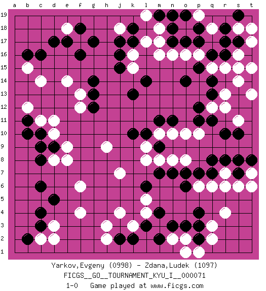 Last move : 1-0 2018 April 14 12:38:44 [Event "FICGS__GO__TOURNAMENT_KYU_I__000071"] [Site "FICGS"] [Date "2017.12.11"] [Round "1"] [Black "Yarkov,Evgeny"] [White "Zdana,Ludek"] [Result "1-0"] [Rating 1 "0998"] [Rating 2 "1097"] 1.q16 r4 2.c16 d3 3.d5 f4 4.c3 c2 5.c4 j4 6.l3 f6 7.b2 d2 8.e17 c14 9.o3 q2 10.c8 d11 11.r10 p10 12.q7 q12 13.q11 r15 14.p11 o10 15.r16 s16 16.s17 s14 17.p12 r12 18.j2 h3 19.t16 s15 20.n11 o8 21.q13 r13 22.q14 s11 23.s10 q15 24.p15 p16 25.p17 o16 26.o17 n16 27.n17 m16 28.o14 t15 29.c10 c11 30.b11 b12 31.b10 e14 32.k17 s18 33.r18 t17 34.r17 m17 35.l14 t18 36.s19 t13 37.g17 b15 38.o6 r6 39.n7 r7 40.r8 q6 41.p7 p6 42.o7 n10 43.m11 m10 44.k10 l8 45.l6 j7 46.p2 q3 47.b16 d10 48.d9 e9 49.k13 k16 50.j16 k15 51.j15 l17 52.k18 m18 53.n18 n19 54.o19 p19 55.m19 l19 56.n19 q18 57.p18 e18 58.d17 f17 59.f16 j18 60.j17 h9 61.m9 l9 62.l10 n8 63.m7 m8 64.p4 d8 65.c9 e8 66.c6 h2 67.g14 f13 68.g13 f12 69.g12 n2 70.n3 o2 71.p3 p1 72.q8 k3 73.k2 l4 74.m4 l5 75.m2 o1 76.s7 s6 77.s8 t7 78.t8 t6 79.f18 1-0 Here are the names of the openings (joseki) played in the four corners : Corner d4 : d3 d5 Komoku (Somok, Xiao~mu`) 3-4 Point. The komoku (3-4) point is the traditional corner enclosure move.. Ikken Takagakari (Hankan Nop'dakeolch'im, Yi Gaogua`jiao~, 1-Space High Approach). The 5-4 approach move has become more popular in modern times, as modern Go emphasizes speed and influence. Corner q4 : r4 l3 Komoku (Somok, Xiao~mu`) 3-4 Point. The komoku (3-4) point is the traditional corner enclosure move.. Corner q16 : q16 q12 Hoshi (Hwajeom, Seongjeom, Xingwei`) 4-4 Point. The star or hoshi (4-4) point, emphasizing influence at the potential expense of territory. Player Black won this Go (weiqi, baduk) game. Follow this game move after move (download)Sacrifice for shape. (Anonymous) I think your argument is specious - I think your tie is ugly. (Gregory House to Dr. Foreman, House M.D.)