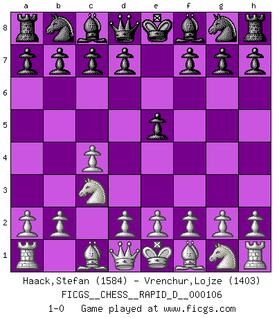 Last move : 1-0 2018 January 16 23:30:57 [Event "FICGS__CHESS__RAPID_D__000106"] [Site "FICGS"] [Date "2017.12.12"] [Round "1"] [White "Haack,Stefan"] [Black "Vrenchur,Lojze"] [Result "1-0"] [WhiteElo "1584"] [BlackElo "1403"] 1.c4 e5 2.Nc3 1-0 This chess game has been lost on time (started : 2017.12.12 12:45:24) English Opening Player White won this chess game. Follow this game move after move (download)It was clear to me that the vulnerable point of the American Grandmaster (Bobby Fischer) was in double-edged, hanging, irrational positions, where he often failed to find a win even in a won position. (Efim Geller) Schach ist das Spiel, das die Verrückten gesund hält. (Albert Einstein) Los finales de Peón son del Ajedrez lo que el cesped es del Golf. (Cecil Purdy) Demandez au pauvre Cg1 ce qu'il en pense. Eduard Gufeld à propos de la variante Saemisch de l'Est-Indienne. Every now and then a man's mind is stretched by a new idea and never shrinks back to its former dimensions. (Oliver Wendell Holmes, Sr.)