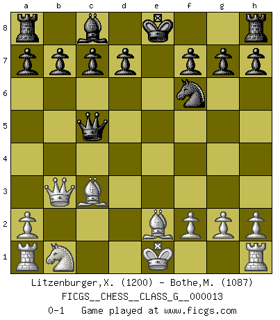 Last move : 0-1 2007 July 30 19:24:48 [Event "FICGS__CHESS__CLASS_G__000013"] [Site "FICGS"] [Date "2007.04.17"] [Round "1"] [White "Litzenburger,Xavier"] [Black "Bothe,Matthias"] [Result "0-1"] [WhiteElo "1200"] [BlackElo "1087"] 1.e4 e5 2.Nf3 Nc6 3.Bc4 Bc5 4.b4 Bxb4 5.c3 Bc5 6.d4 exd4 7.cxd4 Bb4+ 8.Bd2 Qe7 9.Qb3 Qxe4+ 10.Be2 Nxd4 11.Nxd4 Qxd4 12.Bxb4 Nf6 13.Bc3 Qc5 0-1 Evans gambit Player Black won this chess game. Follow this game move after move (download)In blitz, the Knight is stronger than the Bishop. (Vlastimil Hort) Darum geht es im Schach. Einen Tag gibst du deinem Gegner eine Lektion, am nächsten Tag gibt er dir eine. (Robert James Fischer) Fischer deseaba darle a los Rusos una sopa de su propia medicina. (Larry Evans) Il s'avisa de me proposer d'apprendre les échecs qu'il jouait un peu... me voilà forcené des échecs. J'achète un échiquier, je m'enferme dans ma chambre, j'y passe des jours et des nuits à vouloir apprendre par cur toutes les parties. (Jean-Jacques Rousseau, Confessions) It's not the size of the dog in the fight, it's the size of the fight in the dog. (Mark Twain)